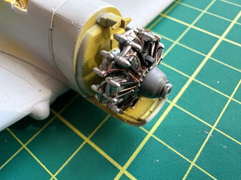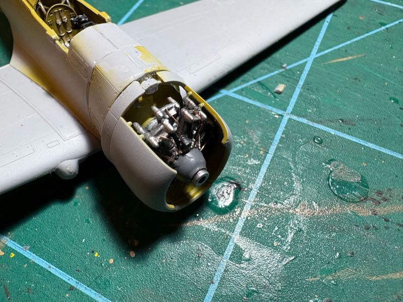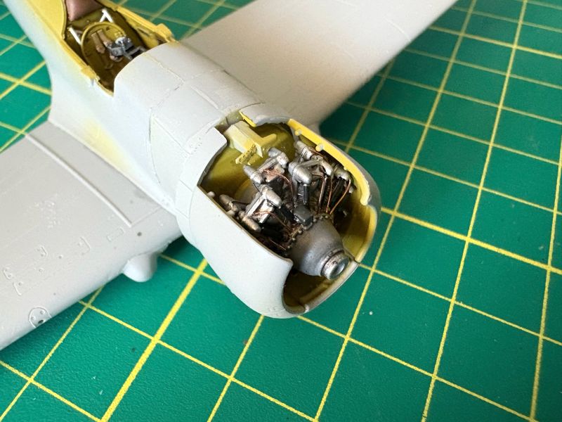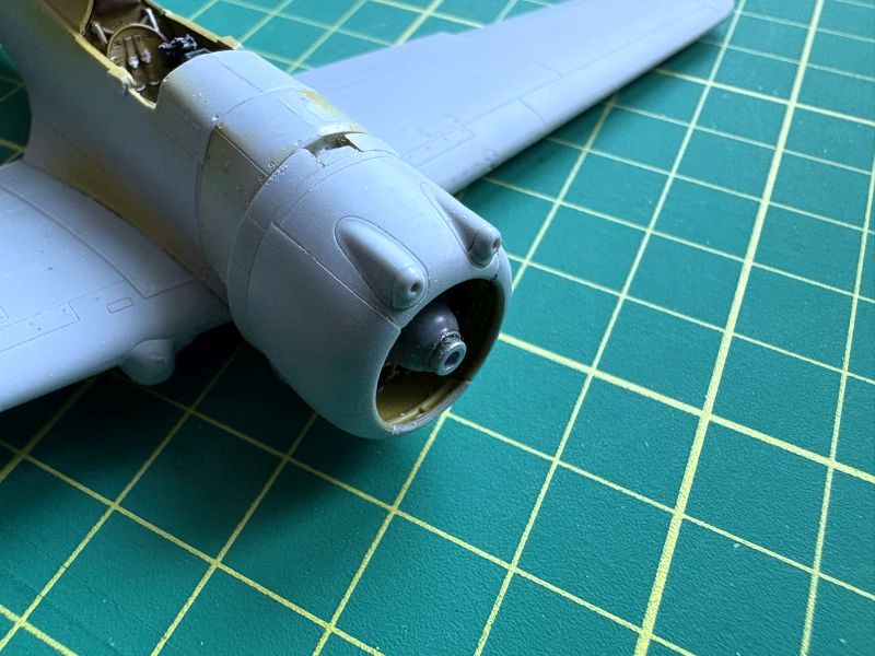 Nieco więcej zabawy było z prawidłowym sklejeniem przedniej części kadłubów w obu modelach. Podejrzewałem, że jakieś niespodzianki mogą tu być, jak to zawsze, gdy Arma wydaje model samolotu napędzanego silnikiem gwiazdowym. Przednia cześć kadłuba i osłona silnika składa się zazwyczaj z kilku elementów, które wymagają sporo uwagi, by prawidłowo złożyć je w całość. Zacząłem od zamontowania na swoich miejscach sklejonych i pomalowanych makiet silników. Nie wytrzymałem i dołożyłem imitacje przewodów. Robiłem je tak, aby nie wystawały za bardzo ponad silnik. Potem dokleiłem osłony boczne z żaluzjami chłodzącymi. Wtedy wyszedł na jaw kolejny zoonk. Po pierwsze, element pozycjonujący górną część osłony jest zbyt wysoko, przez co górna część nie ma styku z bokami. Najlepiej byłoby go spiłować, ale nie miałem już takiej możliwości. Po prostu go obciąłem, zostawiając jedynie tylną część, która jest widoczna z zewnątrz. Teraz już nie miałem żadnych problemów z przyklejeniem górnej części osłony silnika do reszty. Wtedy też okazało się, że muszę zebrać nieco nadmiaru tworzywa w rejonie wklejenia wiatrochronu. Nie do końca dobrze wyprostowałem łapskami zwichrowane połówki kadłubów. Producent zapewnia, że problem ten już został rozwiązany.