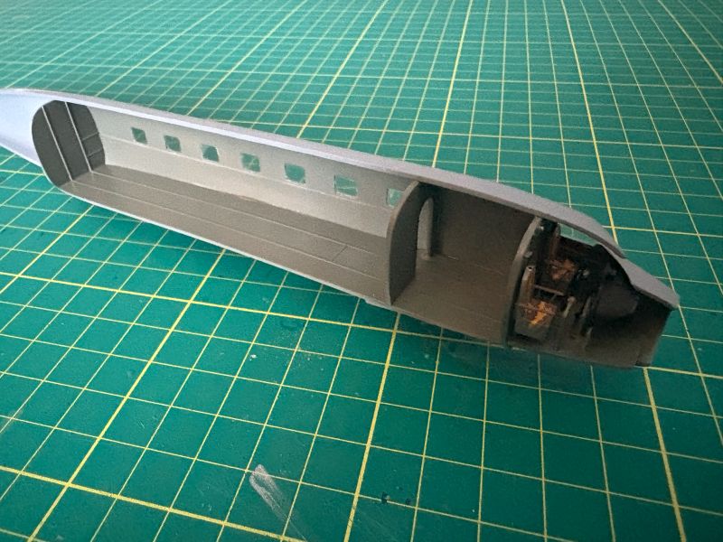 Przystępując do budowy byłem przegotowany na dość ciężką przeprawę, dosłownie modelarskie „krew, pot i łzy”. Model nie najnowszy, wykonany w dodatku w technologii short run i to w najczystszej postaci. Jakież było moje zdziwienie, jak po wycięciu z ramek i dokładnym oczyszczeniu poszczególnych elementów, zwłaszcza ich miejsc styku z innymi elementami, okazało się, że wszystko pasuje do siebie niemal idealnie. Pozwoliło mi to od razu, praktycznie z marszu wypracować sobie koncepcję budowy modelu. Po pierwsze, odpuściłem sobie odtwarzania wnętrza kabiny pasażerskiej. Drzwi i tak były zamknięte a przez okienka nie było wiele widać. Z pasków polistyrenu wykonałem jedynie ścianki, żeby nie mieć żadnych prześwitów w rejonie przejścia skrzydło – kadłub. Nieco więcej uwagi poświęciłem kabinie pilotów, ale też bez przesady. Dokleiłem tylko tyle co widać na zdjęciach.
