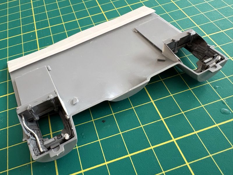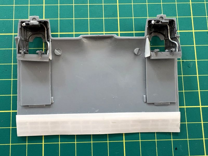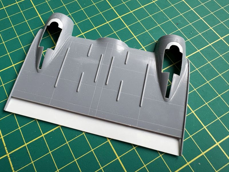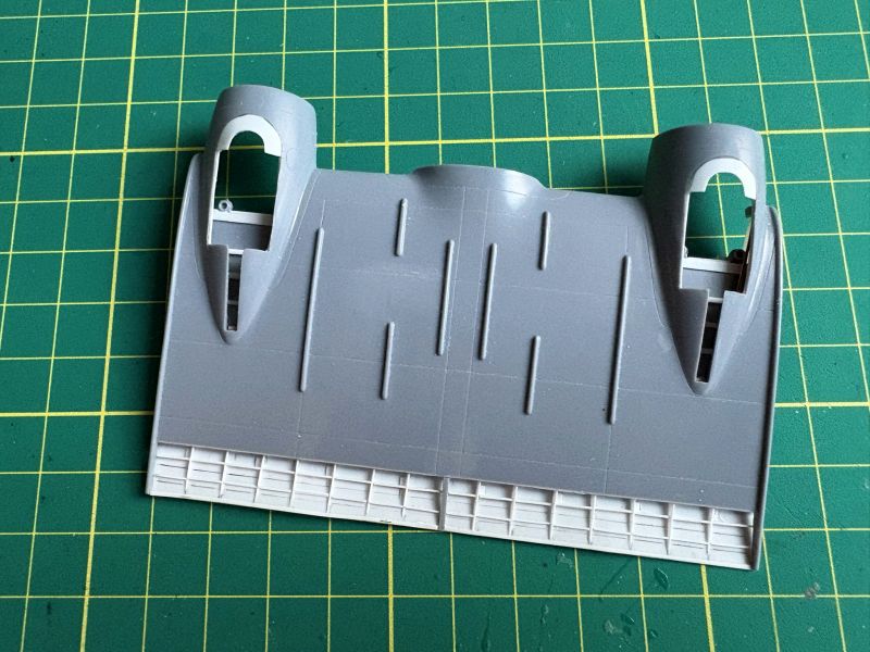 Model skleiłem w całość. Niewielkie szczeliny w niektórych miejscach łączenia wypełniłem akrylową szpachlówką Vallejo i podejrzewam, że gdybym nic nie kombinował z wnętrzem luków podwozia, to by się bez tego obeszło. Uzupełniłem także fakturę powierzchni o panele, które pominął producent, a które znalazłem w planach dołączonych do posiadanej przeze mnie monografii.