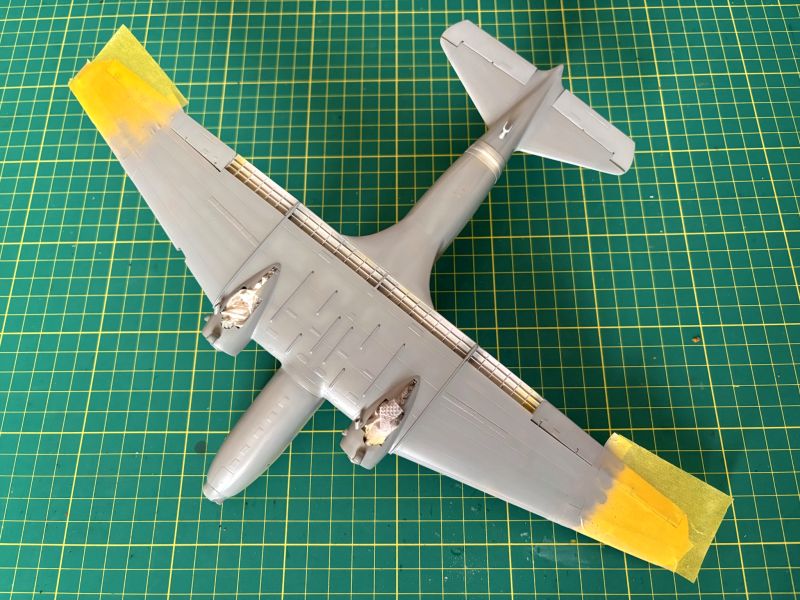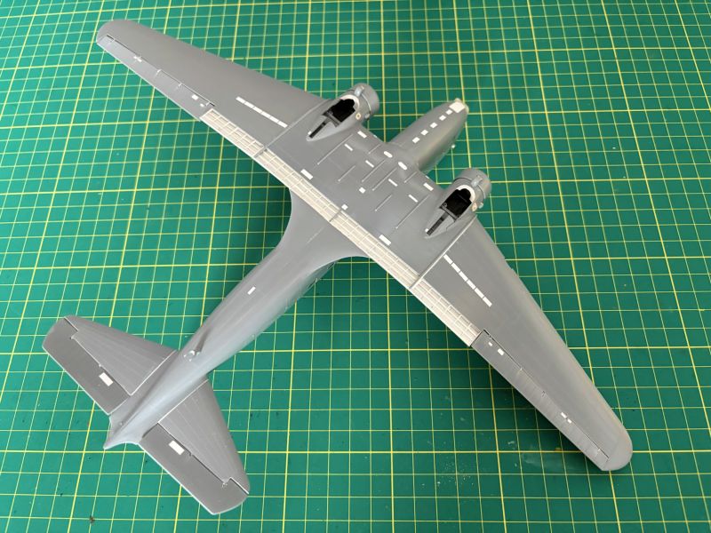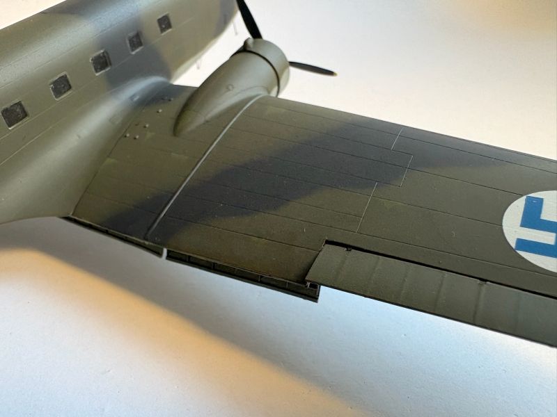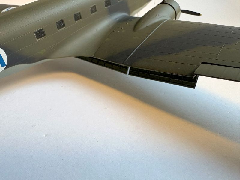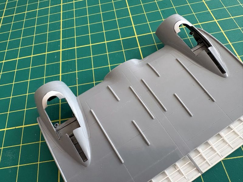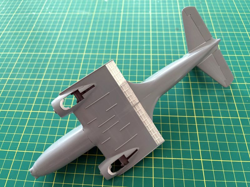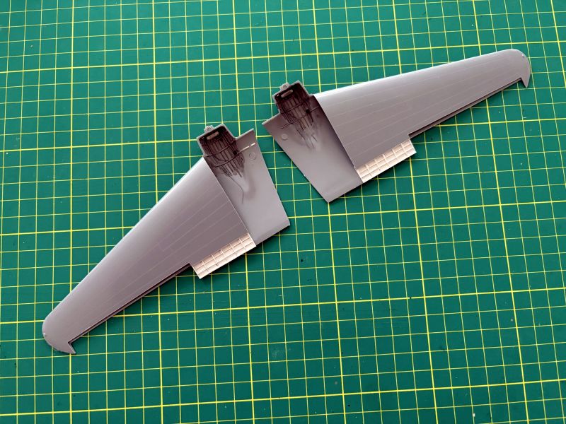 Bardzo obawiałem się także spasowania, a właściwie braku spasowania górnych części skrzydeł z kadłubem. Nawet rozważałem możliwość przyklejenia ich w pierwszej kolejności, aby nie postały jakieś trudne do usunięcia szpary. Okazało się, że wszystko pasuje do siebie idealnie, mogłem skleić skrzydła zgodnie z instrukcją. Wyciąłem jedynie lotki oraz dorobiłem wnęki pod zewnętrzne klapy.
