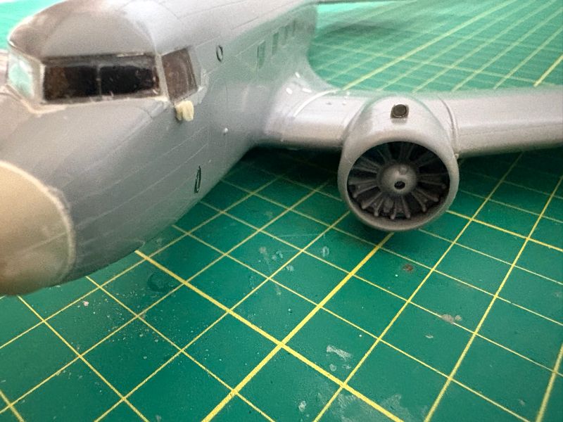 Jeszcze chciałbym zwrócić uwagę na dwie rzeczy. Po pierwsze, wspominana już przeze mnie fatalnie spasowana część nosowa. Wklejona uprzednio polistyrenową musiałem odkleić i zastąpić żywiczną. Po prostu wkleiłem nie ta co trzeba. Ta jest jeszcze gorsza i żałuję, że nie podkleiłem jej kawałkiem tworzywa, żeby nieco zwiększyć jej średnicę u podstawy i w ten sposób dopasować do średnicy kadłuba. Wyszło to tak sobie, zaś gdybym budował model w jakimś malowaniu w naturalnym metalicznym wykończeniu, to wyglądałoby to po prostu źle. Tu gorący apel do producenta, o wykonanie poprawnej części nosowej albo w przypadku dodatku do kolejnych zestawów, lub jako osobnego produktu. Druga sprawa to silniki. Te z zestawu nie wyglądają źle, ale nie należy ich przyklejać, tak jak sugeruje instrukcja, bo będą zbyt głęboko siedzieć w osłonach. Należy je przykleić bezpośrednio do osłon, tak jak to widać na zdjęciu po lewej stronie. Osłony są natomiast dobrze spasowane z gondolami i nie będzie problemu z ich poprawnym przyklejeniem.