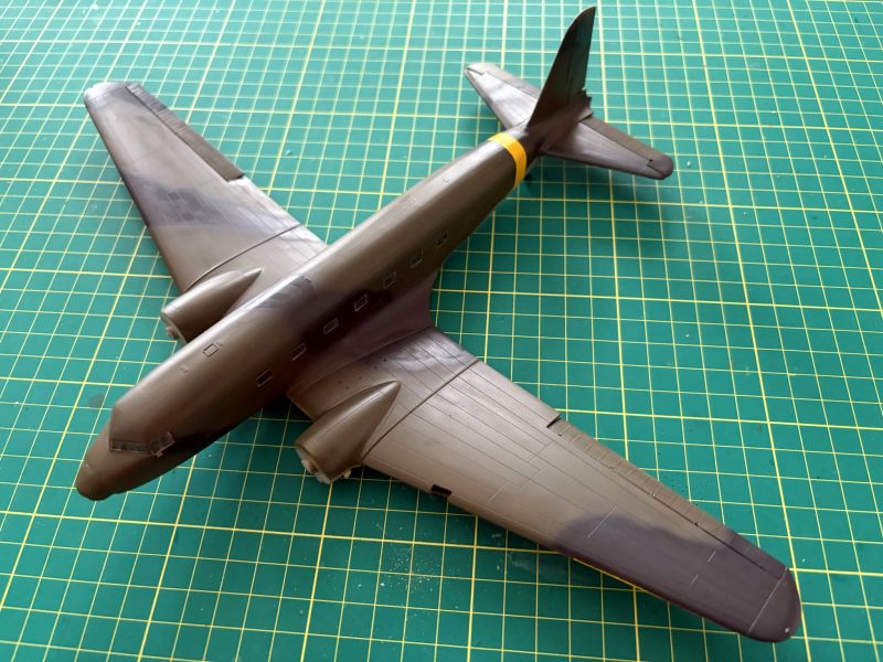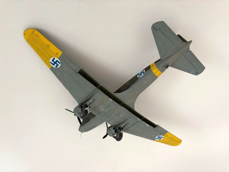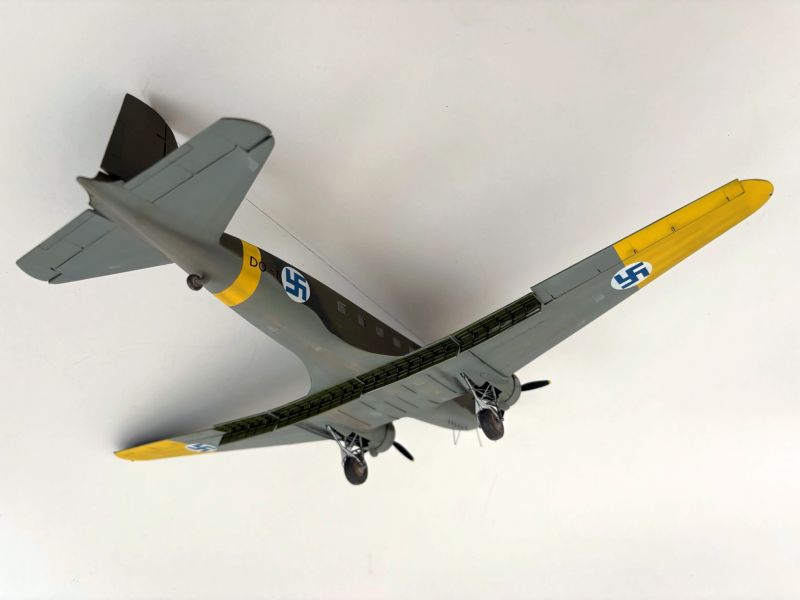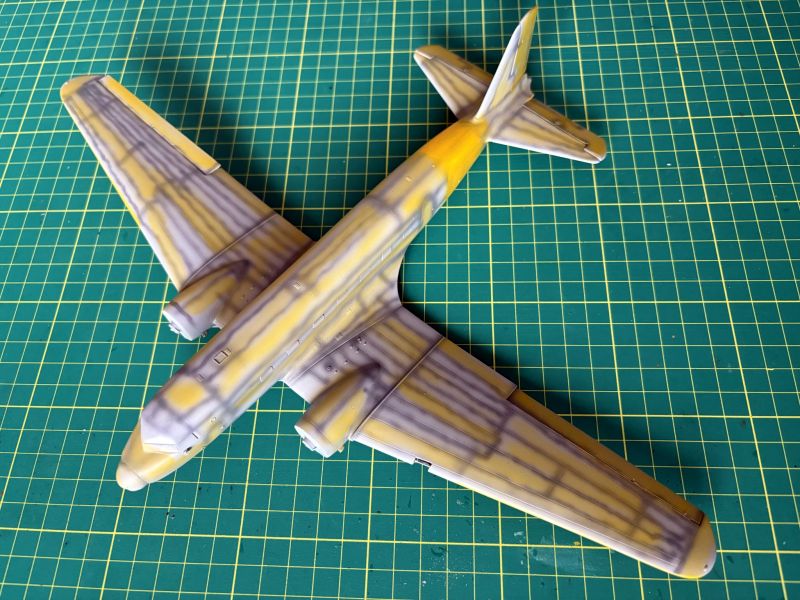 Ale po kolei. Zanim zacząłem je nanosić przykleiłem oczywiście kalkomanie, uprzednio gruntując model sidoluksem. Położyły się bezproblemowo, jedynie trochę zabawy było z tymi poprawnymi politycznie swastykami. Potem były ślady eksploatacji, które ograniczyłem jedynie do kilku zacieków przy silnikach, wlewach paliwa i na powierzchniach sterowych oraz przebarwieniach na poszczególnych kolorach kamuflażu. Całkowicie odpuściłem sobie odpryski lakieru, w końcu był to samolot dla VIP-ów.