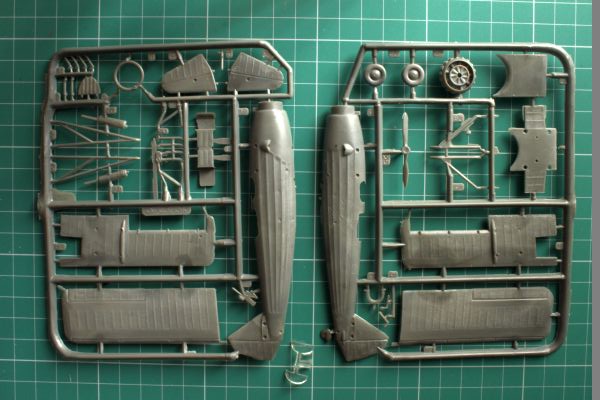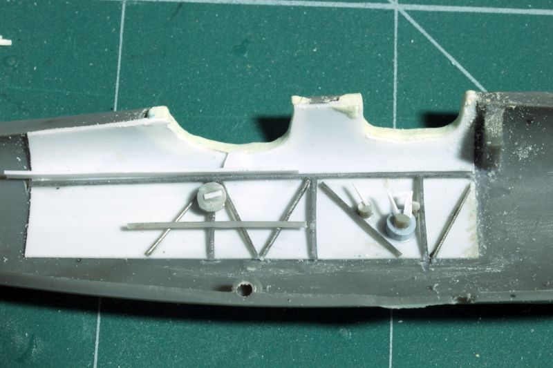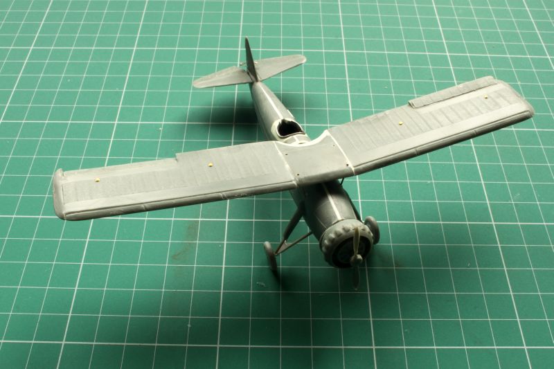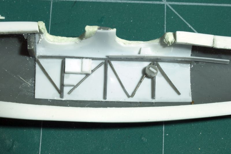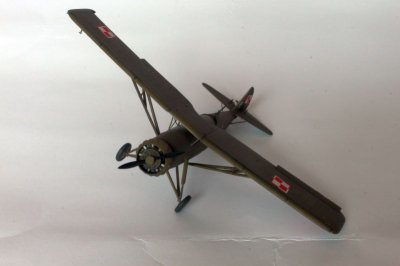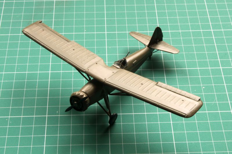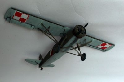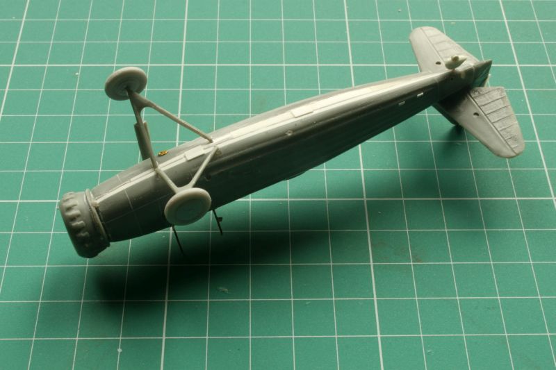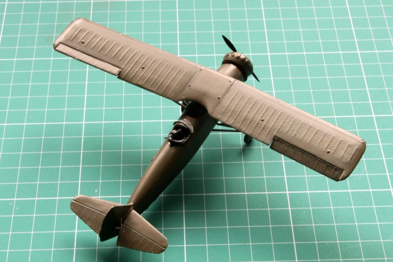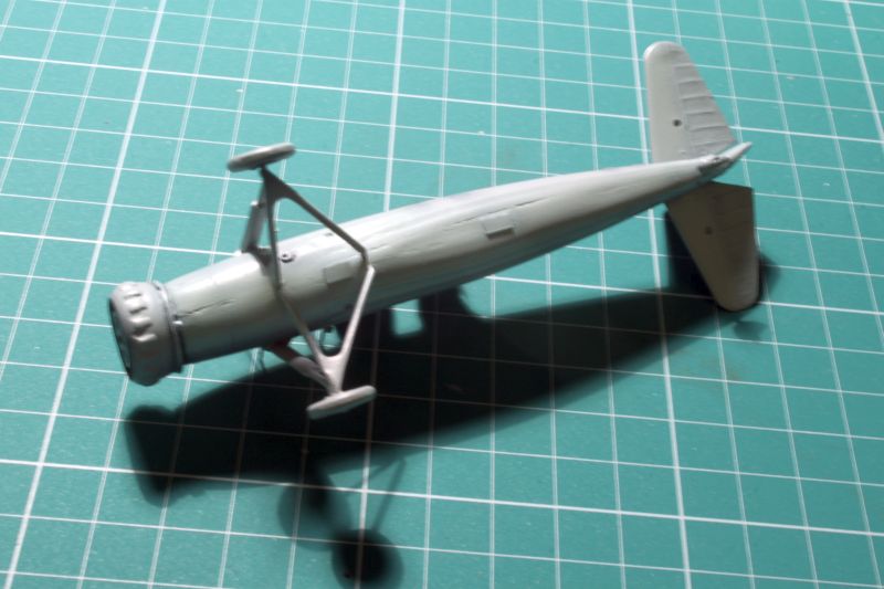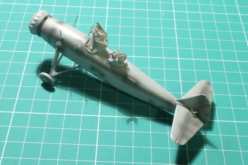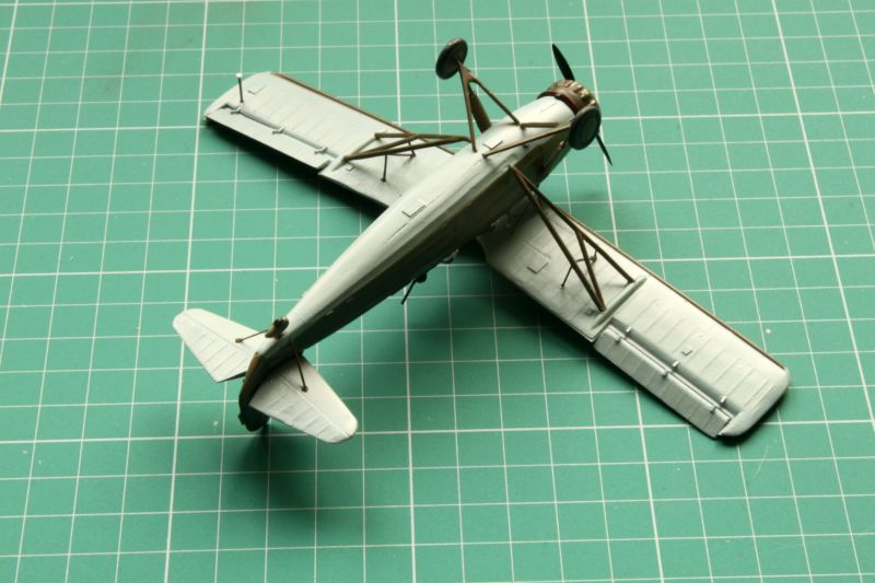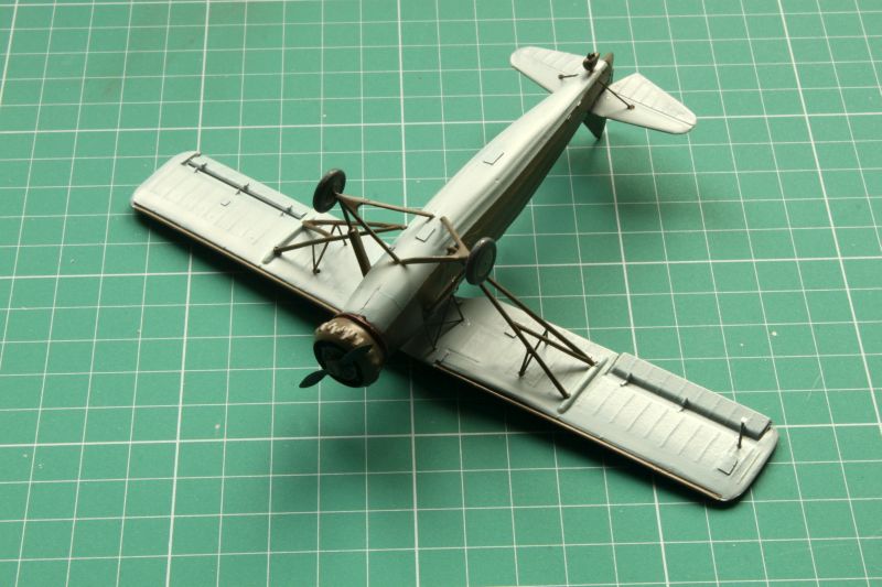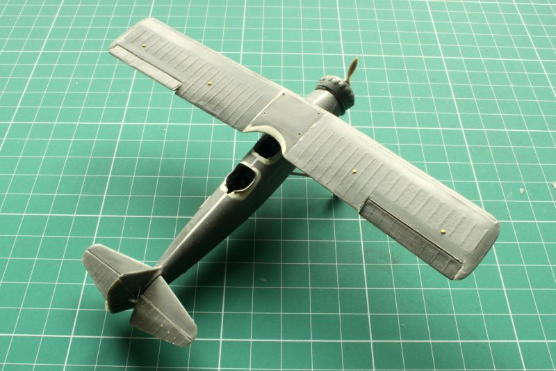 Kolejnym etapem prac było detalowanie kadłuba oraz płata. Do tego celu wykorzystałem kawałki polistyrenu, pręty wyciągane nad ogniem, resztki fototrawionych blaszek, drut cynowy... Zamontowałem także podwozie. Golenie i amortyzatory, to oryginalne elementy, które doprowadziłem do jako takiego stanu przy pomocy skalpela, pilnika i kostek ściernych, koła zaadaptowałem z resztek po P.7a z Arma Hobby (z tego modelu pochodził także fotel pilota). Kółko ogonowe wykonałem od podstaw z kawałka tworzywa. Na nowo wykonałem także ożebrowanie steru kierunku. Ster wysokości pozostawiłem w spokoju, ponieważ miałem dwa rodzaje planów, które były sprzeczne z sobą w tej kwestii. Na tym etapie budowy nawierciłem także otwory pod zastrzały w kadłubie oraz płacie. Centralne zastrzały to kawałki miedzianego drutu, które wpuściłem dość głęboko w kadłub i solidnie przykleiłem klejem cyjanoakrylowym. Następnie wygiąłem je pod odpowiednim kątem i po nasadzeniu płata przyciąłem do pożądanej długości. Uzupełniłem je także o imitacje lusterek wstecznych. Przed przystąpieniem do malowania mogłem się cieszyć sylwetką modelu.