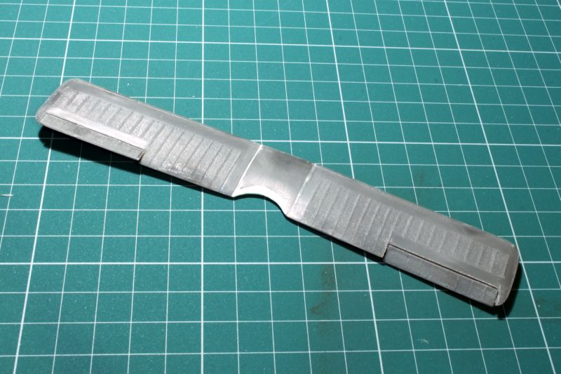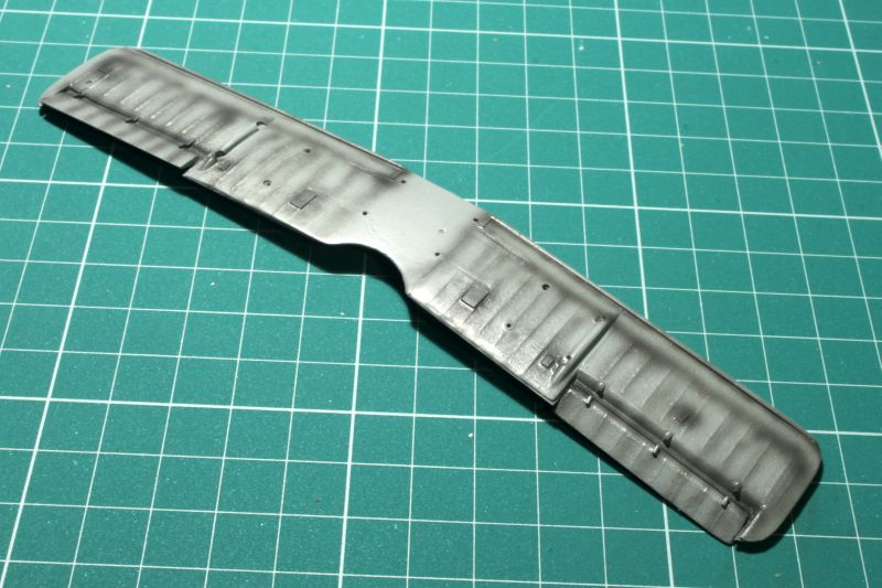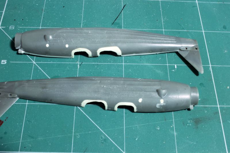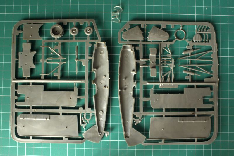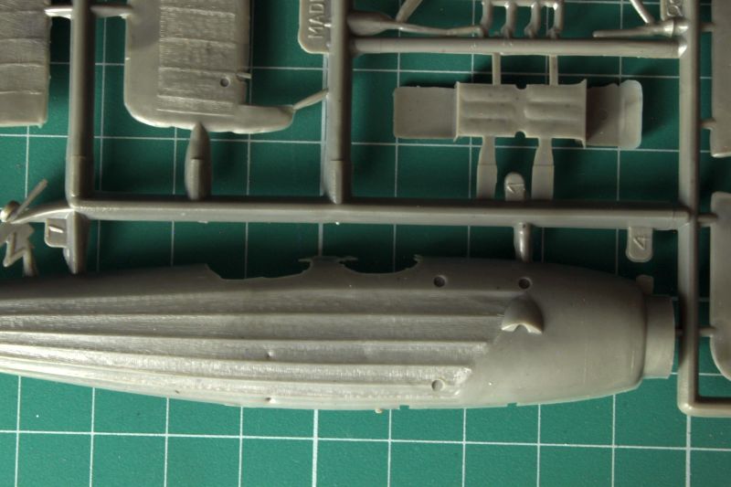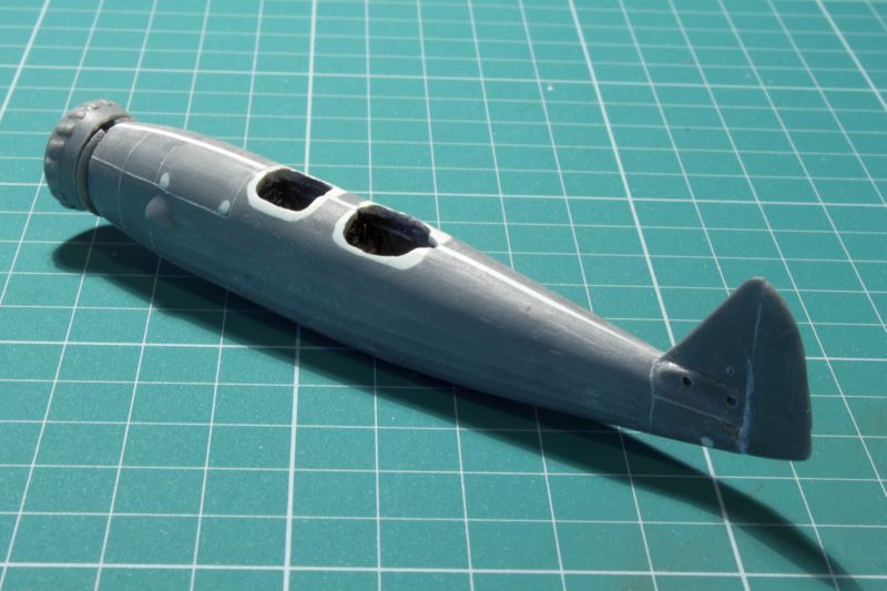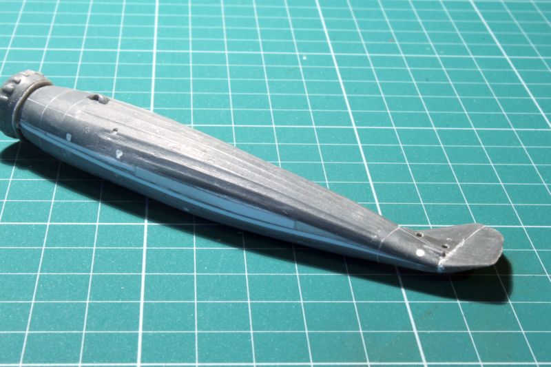 Przy sklejaniu w całość kadłuba okazało się, na dole powstała całkiem pokaźna szczelina. Prawdopodobnie podłoga kabiny była zbyt szeroka. Z problemem poradziłem sobie wkładając w nią kawałki tworzywa i zalewając klejem cyjanoakrylowym. Zresztą wszystkie miejsca łączenia zalałem tym klejem, co ułatwiło mi potem ich obróbkę. Na tym etapie dokleiłem także ster kierunku, zaszlifowując uprzednio imitację żeber, które miały zupełnie nieprawidłowy przebieg, osłonę silnika, którą nawet udało się obrobić pomimo strasznych przesunięć formy w tym miejscu. Na miejscu znalazł się także kolektor spalin, który także musiałem poprawić, rozcinając od góry i obrabiając końcówki na półokrągło.