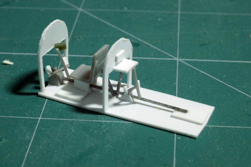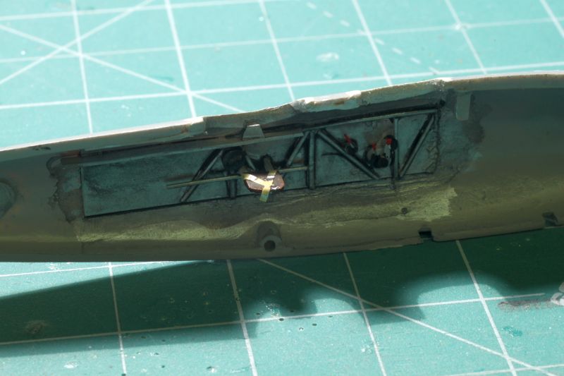 Budowę rozpocząłem od wycięcia i oczyszczenia z nadlewek, tego co nadawało się do wykorzystania podczas budowy. Kadłub postanowiłem poszerzyć i poprawić wycięcia w kabinach załogi. W tym celu od środka wkleiłem kawałki cienkiego polistyrenu, a otwory wypełniłem dwuskładnikową, epoksydową szpachlówką Tamiyi. Po wyschnięciu naniosłem kształt prawidłowych otworów i je wyciąłem, a następnie obrobiłem. Prawą burtę poszerzyłem także kawałkami polistyrenu o grubości 1mm. wyposażenie kabiny zrobiłem sam w oparciu o to, co znalazłem w podręcznej modelarskiej rupieciarni.