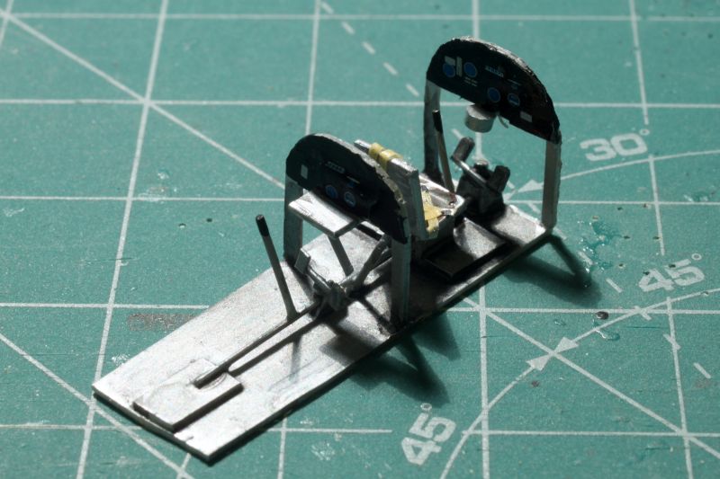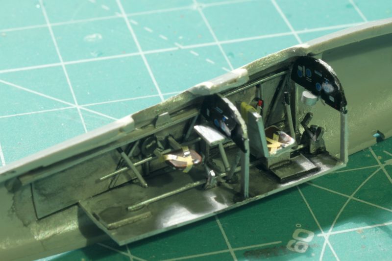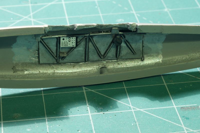 Kokpit został pomalowany, do czego użyłem akryli Hataka i Vallejo. Pasy wykonałem z cienkiej taśmy maskującej, zaś tablice przyrządów to kalkomanie, które pozostały mi po budowie Karasia z IBG Models. Po wyschnięciu farby, całość pokryłem ciemnoszarym waschem, zaś kokpit wkleiłem w lawą burtę kadłuba.