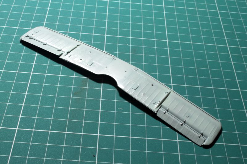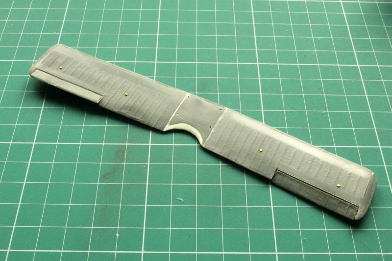 Równolegle z kadłubem majstrowałem przy płacie. Po dokładnym obrobieniu wszystkich elementów, zwłaszcza wpustów umieszczonych w centropłacie, bez większych problemów złożyłem płat w całość. Udało mi się także wykonać lotki jako wychylone. Kolejną czynnością było wypełnienie szpachlówką miejsc łączenia oraz korekta kształtu wycięcia w baldachimie. Używałem do tego szpachlówki epoksydowej, zaś wspomagałem się płynną szpachlówką Gunze. Zaślepiłem także wszystkie otwory pod zastrzały, zarówno w płacie jak i kadłubie.