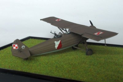 Jak to zwykle bywa na samym końcu wkleiłem to, co mogło się uszkodzić podczas malowania, czyli oszklenie, karabin (wymieniłem mu lufę i tylec, dorobiłem muszkę i celownik), śmigło, napędy lotek i sterów oraz rurkę pitota. Potem zabrałem się za kalkomanie. Szachownice z zestawu nie nadawały się do niczego, bo były za duże, więc wykorzystałem tylko logo LWS i oznaczenie apteczki. Godła pochodziły ze starych zapasów, zaś szachownice to produkt włoskiego Cartografa z zestawu do P.7a z Arma Hobby. Na sam koniec wasch w niektóre miejsce i trochę suchych pigmentów w odpowiednich kolorach w kolektor spalin, wydech i podwozie.