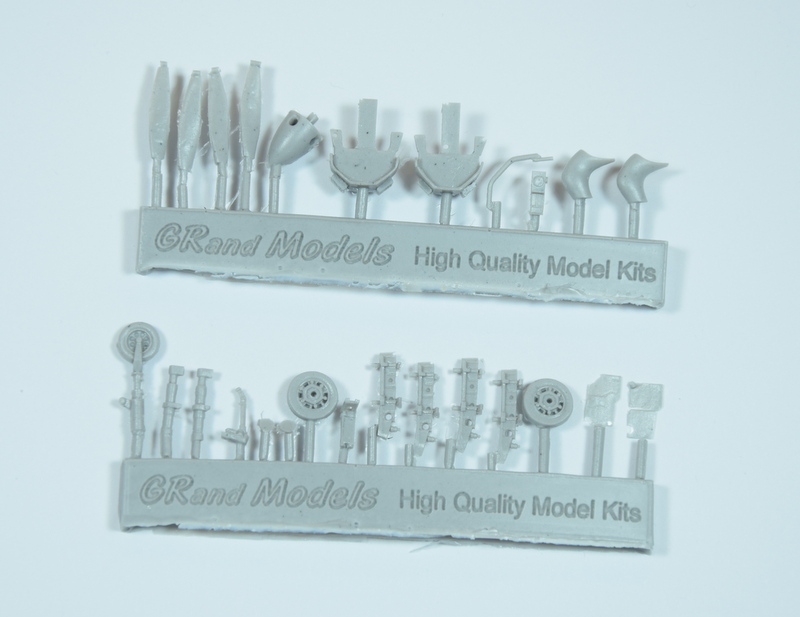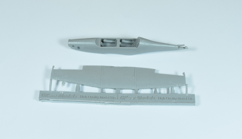 Elementy żywiczne wypakowane z woreczków strunowych pogrupowane na poszczególne sekcje budowy modelu. Ciekawym rozwiązaniem jest kadłub odlany w jednym kawałku bez dzielenia na dwie części, w którym w przedniej części jest zatopiony odpowiedniej wagi balast zapobiegający przeważaniu modelu na ogon. Co jest częstą bolączką modelarzy, zwłaszcza tych początkujących.
