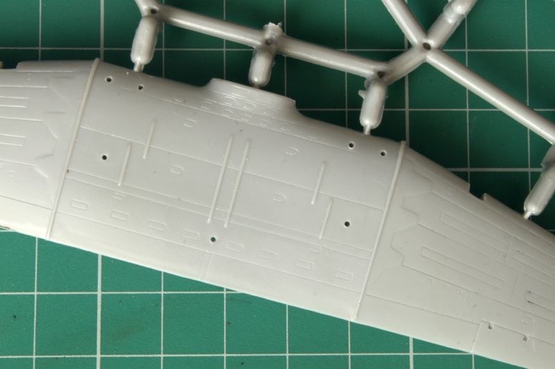 Jak widać na powyższych zdjęciach faktura powierzchni płatowca jest oddana bardzo ładnie i co najważniejsze, wiernie w stosunku do oryginału. Linie podziału są wklęsłe, równe i poprowadzone w prawidłowych miejscach. Nadlewki są, jak to przy modelach tego typu, ale występują w rozsądnej ilości i są raczej łatwe do usunięcia. Także inna zmora modelarza, czyli jamki skurczowe nie odstraszają potencjalnych amatorów klejenia tego modelu. Ja dopatrzyłem się jednej, na końcówce płata. Jest chyba też jakaś przy przejściu skrzydło kadłub. Ich likwidacja nie powinna w jakiś zanczący sposób przedłużyć prac nad modelem. Coś, co wygląda jak gigantyczna skaza znajduje się na grzbiecie kadłuba. Jest to po prostu cieńsze tworzywo, w miejscu Rosjanie montowali wieżyczki strzeleckie. Tworzywo w tym miejscu się zapada i potrzebna jest reakcja modelarza. Na szczęście nie ma tam linii podziału, więc nacinanie nam odpadnie. Producent wyprasek niestety dość po macoszemu potraktował luki podwozia. W oryginale były one dość głębokie, a ponieważ były pozbawione pokryw, sporo przez nie widać. Czeka nas zetem krojenie dolnej części płata i wypełnianie detalami. Sam osobiście mam zamiar się pobawić.