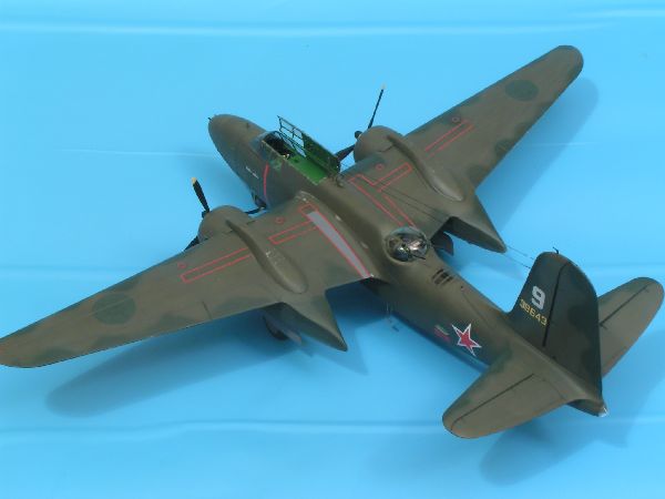 Do budowy poła użył mi zestaw AMT/ERTL konfekcjonowany przez Italeri, zestawy blach Eduarda (detale i luki podwozia) oraz żywiczne lufy karabinów Quickboost. Model choć nieco leciwy był przyjemny w budowie, dobrze spasowany, szpachlowanie ograniczone zostało do minimum. Nieco rozczarowały natomiast blaszki Edka, niezbyt dobrze dopasowane, jakby z innej bajki, ale w ostatecznym rozrachunku spełniły swoje zadanie, dzięki nim model mocno zyskał. Do malowania używałem farb Vallejo, a do brudzenia pigmentów Talena. Model również został nieco zmodyfikowany, przerobiłem go na wersję torpedową opracowaną w ZSRS. Sama torpeda została wykonana od podstaw. Była to jedyna moja ingerencja w zestaw – model zachował standardową amerykańską konfigurację z pełnym nosem i uzbrojeniem składającym się z 6 kmów 12,7 w nosie kadłuba oraz 2 w wieżyczce grzbietowej. Schemat malowania oparłem na zdjęciach archiwalnych, numery samolotu oraz oznaczenia zatopionych okrętów wroga, wobec braku jednoznacznych danych źródłowych, są tylko prawdopodobne. Ze zdjęć tych wynikało również, że samoloty były dosyć zadbane, a ślady eksploatacji występowały w stopniu minimalnym, co uwzględniłem przy budowie.
