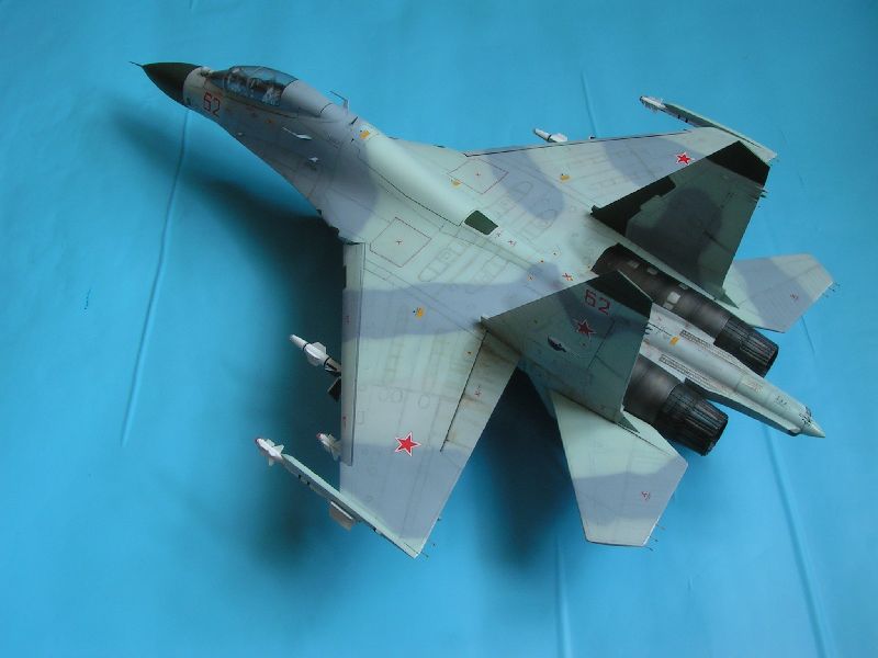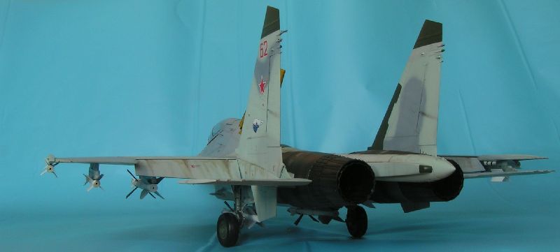 Model kleiło się dobrze, choć jego spore wymiary sprawiały, że nie było to zbyt wygodne zajęcie. Trochę miejsc łączenia poszczególnych elementów wymagało użycia szpachli. Bardzo dobrze wypadły również blachy Eduarda, wszystkie dobrze spasowane z elementami modelu, zaś blaszki wykonane w technologi self - adchesive, bardzo ułatwiają montaż, kiedy coś źle przykleimy, wystraczy odkleić i powtórzyć czynność, kiedy wszystko jest na swoim miejscu, można zabezpieczyć detal minimalną ilością kleju CA. Do malowania użyłem standardowo farb akrylowych Vallejo i po raz pierwszy na szeroką skalę metalizerów ich produkcji oraz gotowych waschów. Z obu produktów jestem bardzo zadowolony, udało mi się w miarę realistycznie wymalować dysze silników oraz ślady ekspolatacyjne. Model wykonałem w malowaniau 159 GwIAP z Kluczewa, używałem własnych mieszanek farb, na bazie piałej, którą barwiłem na błękino, szaro oraz szarobłękino - moim zamiarem było uzyskanie dośc charakterystycznej, wypłowiałej mozajki kolorów, jak na zdjęciach prawdziwych Su-27 podczas ich stacjonowania w Polsce. Na tych zdjęciach było również wyraźnie widoczne, że samoloty były dosyć zapuszcone, stąd obecność śladów eksploatacji praktycznie na całej powiezchni płatowca.