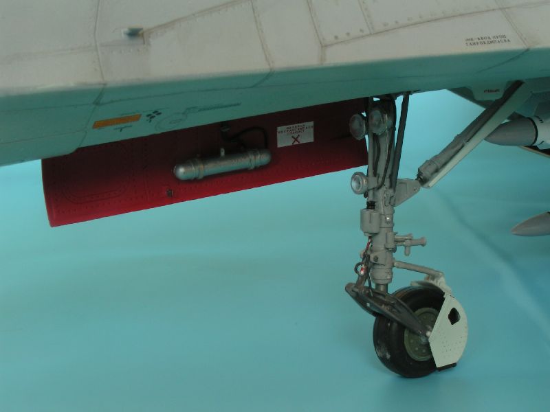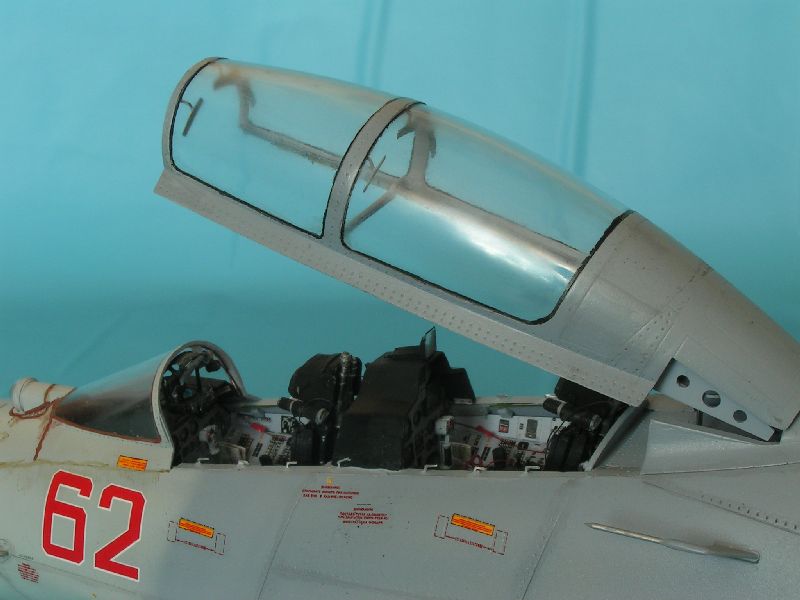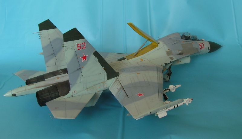 Model szkolno - bojowej "Suczki" pomimo, iż na pierwszy rzut oka szczegółowy i dokładny, wymaga jednak trochę waloryzacji, aby po sklejeniu nie wygladał jak pomnik lub zabawka. Podczas budowy posiłkowałem się blaszkami Eduarda (ED32137 Su-27B Flanker exterior parts oraz ED32662 Su-27UB Flanker interior parts - kiedy gromadziłem dodatki nie było jeszcze blaszki ED32255 Su-27UB Flanker exterior parts). Standardowe fotele wymieniłem również na ich żywiczne zaminniki firmy Quickboost (QUB32043). Uzupełnienia o przewody instalacji wymagały luki podwozia i samo podwozie. Wszystkie kable wykonałem od podstaw posiłkując się zdjęciami oryginału. Od podstaw wykonałem również teleskopowy mechanizm otwierania kabiny. Tutaj Trumpeter nie popisał się zupełnie traktując to miejsce wyjątkowo po macoszemu. Również należy zwrócic uwagę na podwozie. Przewidziano tutaj mozliwośc wykonania pracujących amorytzatorów, lecz producent nie przemyślał do końca wykonania tego mechanizmu, co sprawia, że są to najbardziej delikatne podzespoły w całym modelu, bardzo należy uważać przestawijąc go, podnosząc, stawiając itp.