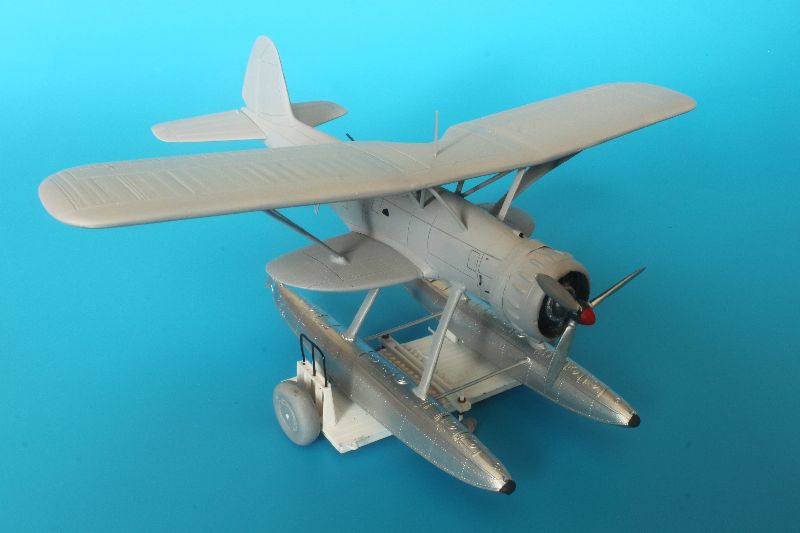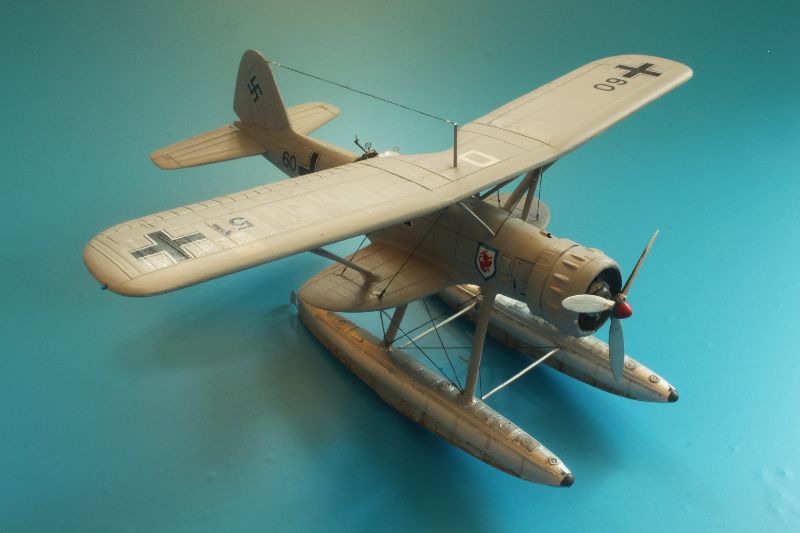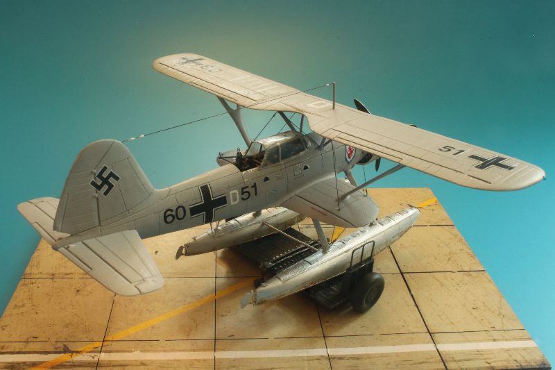 Model z firmy TopGun pomimo, że dokładny i szczegółowy, postanowiłem troszkę stuningować. W tym celu wykorzystałem większość elementów z blaszki do Arado Ar-196 z Eduarda oraz żywiczny km MG-17 z Airesa. Pudełkowe malowanie szwedzkie zastąpiłem, niemieckim z 1/FuFlGr 506 (506 Pułk Lotnictwa Przybrzeżnego) z Dziwnowa z 1936r. Żeby model prezentował się efektownie od podstaw wykonałem replikę wózka transportowego, na którym ustawiłem zbudowaną miniaturę.