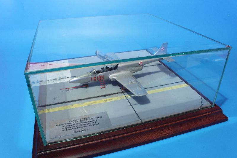 Początkowo planowaliśmy budowę makiety samego pomnika, jednakże po naradzie wojennej z Panem Dyrektorem 11-tki postanowiliśmy ustawić model na makiecie płyty postojowej lotniska i pokazać Iskrę taką, jak pełniła służbę w 40 ELT. Dlatego po pomalowaniu otrzymała delikatny wach i trochę zabrudzeń, których rozmieszczenie wykonałem zgodnie z posiadanymi zdjęciami oryginału. Na podstawie zdjęć odtworzyłem również wygląd płyty postojowej lotniska w Smardzku oraz elementy wyposażenia lotniska które zrobiłem z kawałków polistyrenu i drutu różnej grubości. Końcowym etapem prac było przyklejenie płyty wraz z modelem do drewnianej podstawki i przykrycie całości szklaną gablotą. W takim stanie model trafił do rąk Pani Dyrektor Szkoły nr 3 w Świdwinie.