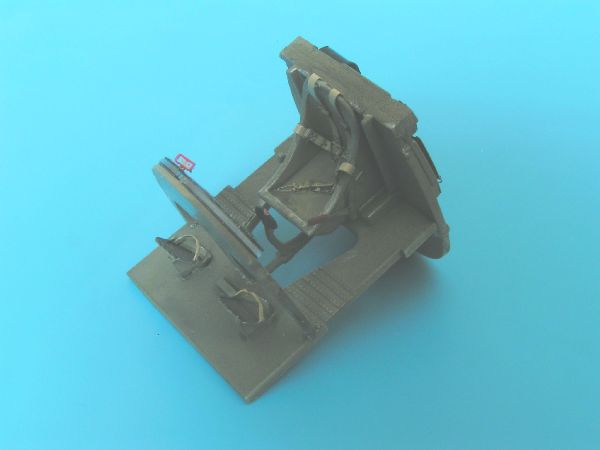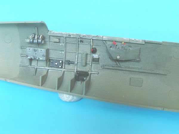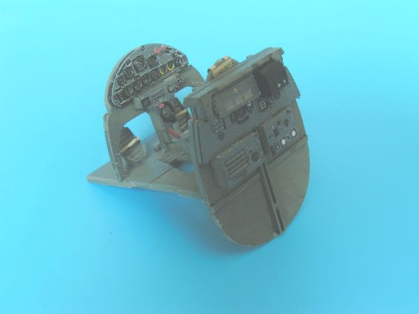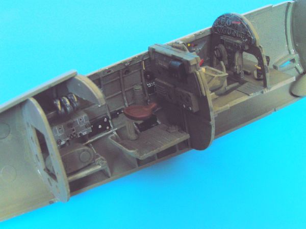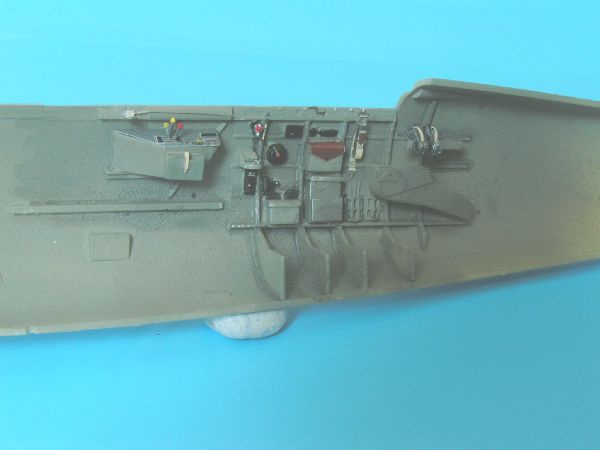 Proces klejenia zacząłem nietypowo, bo od zredukowania większości elementów w ramkach. Sklejony został zatem płat, usterzenie i kilka segmentów wyposażenia kadłuba, czyli rama silnika ze ścianą ogniową, podłoga kabiny pilota wraz z fotelem i temu podobne rzeczy. Potem na warsztat poszły fototrawki. Ponieważ zestaw Eduarda składał się z dwóch blaszek, barwionej z elementami samoprzylepnymi i zwykłej, oklejanie wnętrza kokpitu zacząłem od tej ostatniej. Wkleiłem praktycznie wszystko, co miało zostać pomalowane kolorem wnętrza w moim wypadku farbą z palety Italeri. Wcześniej malowane powierzchnie zagruntowałem białym podkładem Citadela. Po wyschnięciu farby wklejone zostały blaszki kolorowe. Bardzo lubię te samoprzylepne. Są proste w montażu i nawet jak coś nie wyjdzie można odkleić i poprawić. Jedyną moją ingerencją w zestaw Edka, było sklejenie tablicy przyrządów.