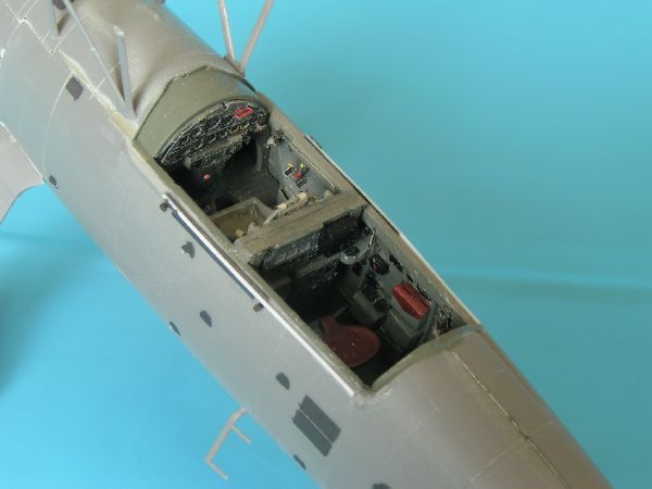 Nie montowałem tego jak chce instrukcja na zeszlifowanym przezroczystym elemencie modelu, tylko w zmienionej nieco kolejności. Najpierw blaszka z zegarami, potem do niej na klej CA przezroczysty element ICMu i dopiero na to właściwa tablica przyrządów. W prosty sposób uzyskałem przestrzenny i przeszklony element. Kabina załogi to jeden z mocniejszych punktów zestawu, nie dziwię się że producent kat, ją dopieścił – po zmontowaniu w całość wszystko jest doskonale widoczne. Można było zatem zmontować w całość kabinę i kadłub. Niestety uległem nieco urokowi modelu ICM-u w ramkach i błędnie złożyłem, że poszczególne elementy są prawidłowo spasowane względem siebie.