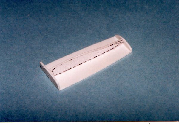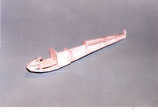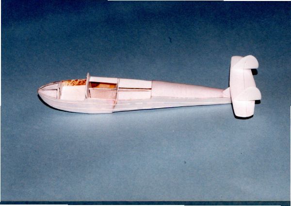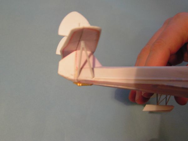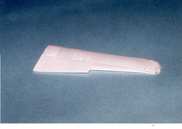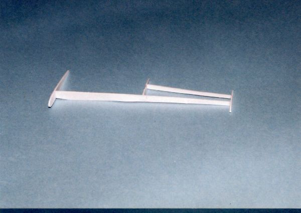 Po obrobieniu tych elementów wykonałem dolną część steru kierunku, przy tej czynności postępowałem tak jak przy klejeniu tego typu elementów w modelach kartonowych, zastosowałem tylko inne tworzywo. Ostatnią czynnością było doklejenie listew po bokach i na spodzie kadłuba i obróbka całości. Usterzenie wykonałem z polistyrenu o grubości 1mm. Skleiłem z sobą dwa kawałki takich płytek i za pomocą szablonów z kalki technicznej naniosłem na nie wykroje poszczególnych elementów. Po wycięciu obrobiłem papierem ściernym nadając odpowiedni kształt i przekrój. Kiedy wszystkie elementy zostały oczyszczone i wypolerowane zmontowałem wszystko w jedną całość i przykleiłem do kadłuba.