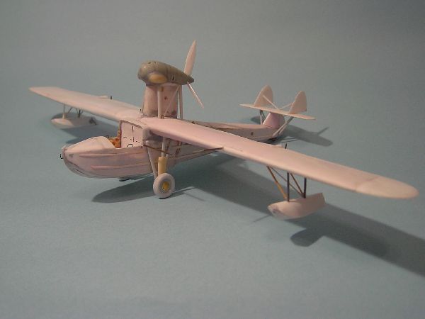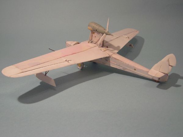 Mogłem teraz zabrać się za gondolę silnika, podstawę wykonałem podobnie jak oba płaty. Polistyrenowy szkielet oklejony kawałkiem opakowania po lodach i nadepnie oszlifowany do uzyskania satysfakcjonującego nie kształtu. Po wycięciu i nawierceniu otworów, które udało mi się zaobserwować na zdjęciach przykleiłem podstawę do kadłuba, znów szpachlowanie, szlifowanie i można było zająć się samą gondolą. Jako element wyjściowy posłużył mi podwieszany zbiornik paliwa od Bf-109. Po sklejeniu wyciąłem z niego dwie środkowe sekcje i końcówkę, z której później zrobiłem kołpak śmigła. Kiedy uzyskałem odpowiedni kształt, cały element został szpachlowany i oszlifowany. Następnie dokleiłem wykonane z kawałków żywicy wyoblenia w przedniej dolnej części i w oparciu o posiadane zdjęcia nawierciłem otwory. Całość dokleiłem do podstawy, i znów szpachlowanie, obrabianie…itp., itd. Lotki wykonałem w ten sam sposób jak płaty i wkleiłem w stosowne miejsca.