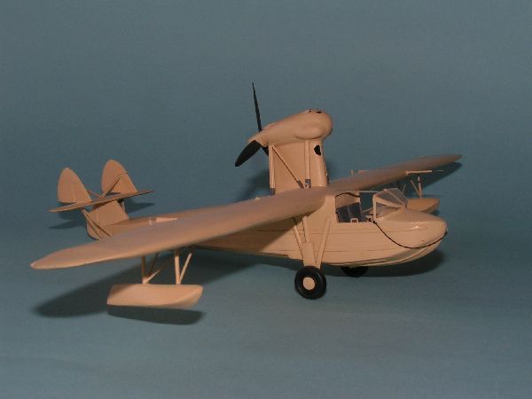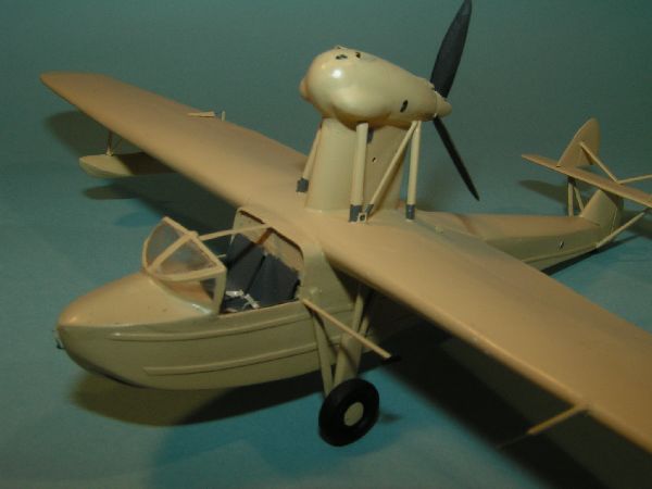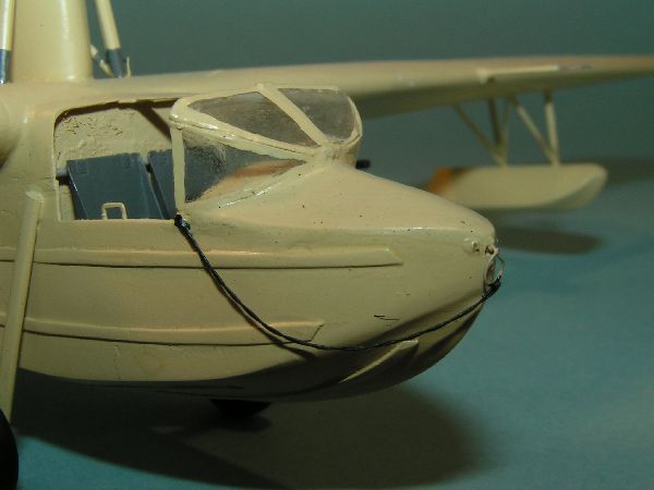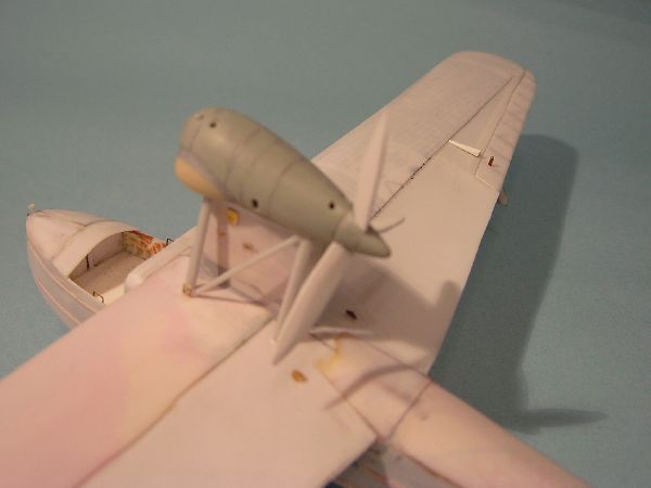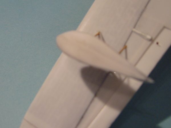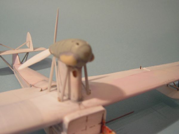 Śmigło to obrobiona końcówka zbiornika, który posłużył do wykonania gondoli silnika, zaś łopaty wykonałem z kawałka polistyrenu. Po nadaniu im odpowiedniego kształtu przykleiłem do kołpaka, a po wyschnięciu całość do gondoli. Ostatnią czynnością na tym etapie prac były pływaki boczne, montaż taki sam jak w przypadku kadłuba.