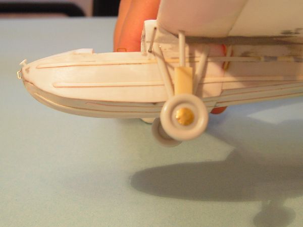 Po wyrównaniu wszystkich elementów i zjedzeniu kolejnego opakowania lodów zabrałem się za oklejanie skrzydeł. Tutaj pojawił się mały problem, ponieważ z opisu samolotu wynikało, że przednia część skrzydeł do drugiego dźwigara był kryta sklejką, zaś za drugim dźwigarem, płótnem. Na zdjęciach wyraźnie widać różnice w pokryciu, lecz płótno jest bardzo nocno naciągnięte i nie ma charakterystycznej dla „szmatopłatów” faktury powierzchni. Postanowiłem całe skrzydła okleić polistyrenem akcentując tylko różnice w pokryciu, nadając w tym miejscu niewielki uskok. Potem przyszła kolejna porcja szlifowania wyrównywania i polerowania obu płatów, by na koniec przykleić je do centropłata. Gdy wszystko już było gotowe skleiłem płat z kadłubem. Potem zająłem się wypełnianiem wszystkich ubytków szczelin itp. Było tego naprawdę dużo, więc zużyłem sporo szpachlówki, polistyrenu i kleju cyjanoakrylowego.
