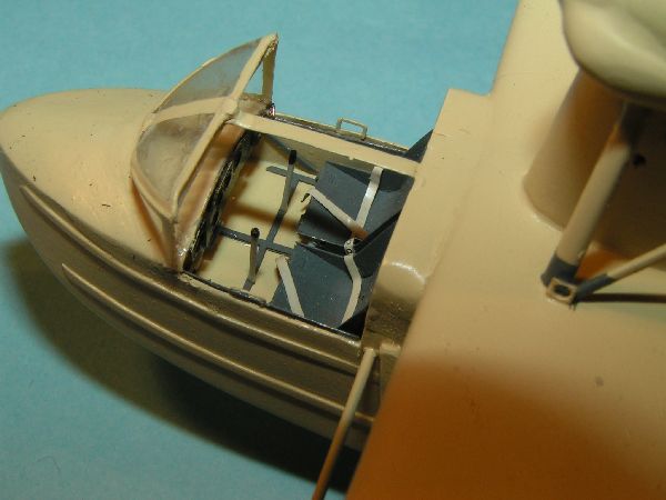 Największym wyzwaniem podczas prac nad modelem była kabina, gdyż nie dysponowałem praktycznie żadną dokumentacją na jej temat. Wyszedłem jednak z założenia, że skoro krakowscy producenci modeli żywicznych z powodzeniem wprowadzili na rynek modele francuskich łodzi latających z lat 20-tych i jest powszechnie wiadome jak skąpa jest dokumentacja na ich temat, to mogę to zrobić i ja. Jako materiał wyjściowy do wykonania kabiny w moim A-2 posłużyły mi relacje z budowy Lathama i Camsa zamieszczone swego czasu w Mini Replice. Poszczególne detale takie jak fragmenty konstrukcji kadłuba, fotele z pasami, orczyki i tablica przyrządów pochodzą z blaszki Parta. Kolorystyka wnętrza to H 148, H 33 i H 106. Wykonałem model jako dwuster, wychodząc z założenia, że skoro był to samolot szkolno-obserwacyjny to musiał mieć zdojony zestaw przyrządów pokładowych. Wyposażenie jest nader skromne i nie zostały wykonane wszystkie jego elementy, lecz nie chciałem z tym przesadzać nie dysponując żadnym materiałem ikonograficznym. Może są jakieś zdjęcia czekające na publikację, które pozwolą mi w przyszłości te braki uzupełnić. Temat traktuję na razie jako otwarty. Wiatrochron został wykonany z kawałków pleksi z jakiegoś opakowania po zabawkach moich córek. Miło ono nieco wyoblony kształt i świetnie nadawało się do tego celu. Oczywiście gdybym napisał, że udało mi się to bezbłędnie skleić za pierwszym razem, napisałabym potworną nieprawdę. Plany wskazują, że nikol miał mieć zamkniętą kabinę. Może takie były założenia projektowe, jednak zdjęcia wykonane podczas prób w Pucku ewidentnie temu zaprzeczają. Samolot ma kabinę otwartą i tylko podłużny element pomiędzy wiatrochronem a tylną częścią kabiny może wskazywać, że kabina miała mieć zamykaną osłonę. Ja zrobiłem ją jednak tak jak wyglądała w czasie prób. Lina cumownicza to pomalowany na czarno kawałek kabla komputerowego którego zdjąłem izolację.