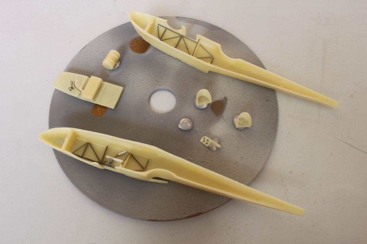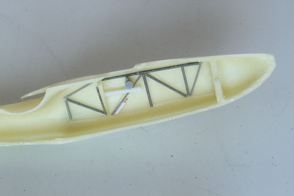 Zatem do roboty. Najpierw oczyściłem wszystkie elementy modelu z resztek żywicy. Samo klejenie zacząłem tradycyjnie od wnętrza kadłuba, a dokładniej od kabiny pilotów. Dołożyłem trochę od siebie, bo niestety już tak mam, ale nie jest to żaden przytyk dla producentów. Ponieważ wnętrze oryginału miało kolor sklejki, tak zostało pomalowane w budowanej przeze mnie replice. Po zmontowaniu kabiny skleiłem w całość kadłub.