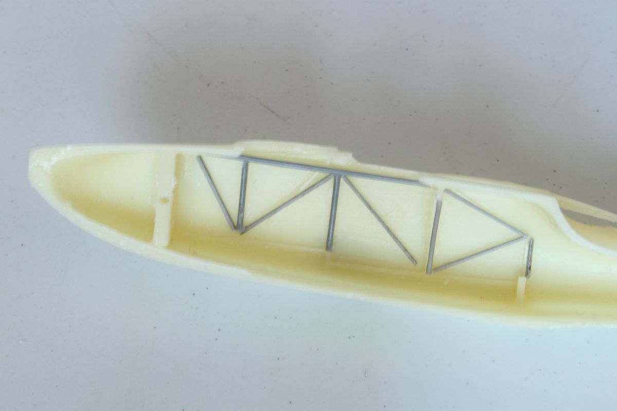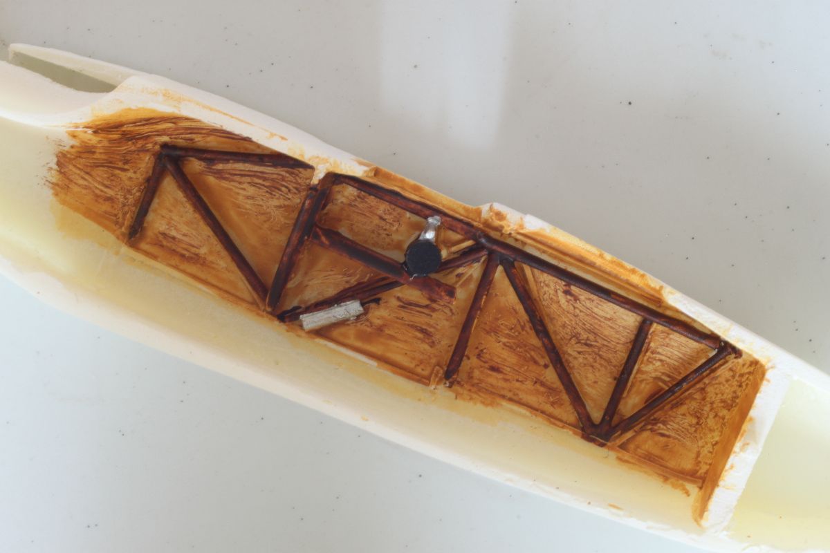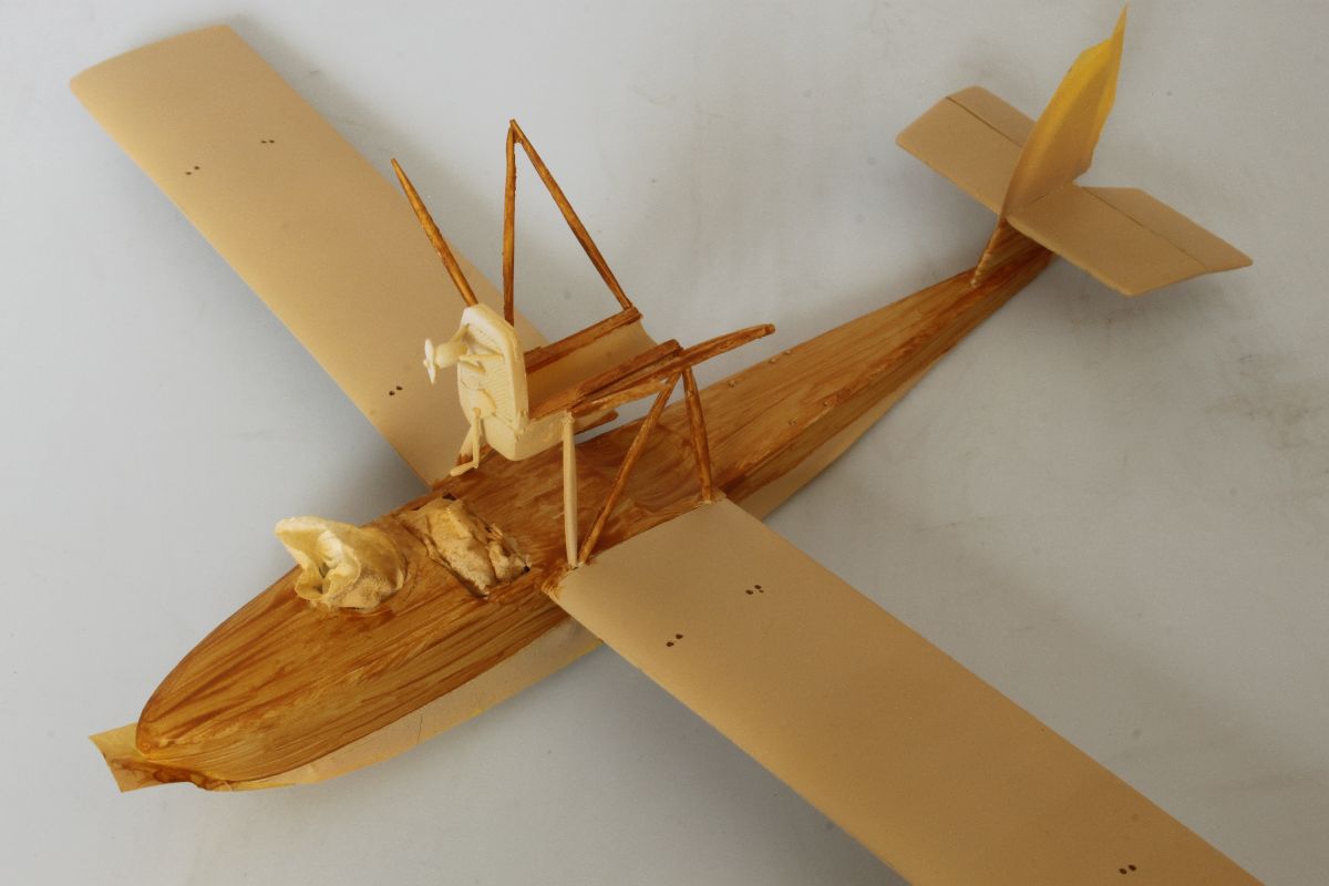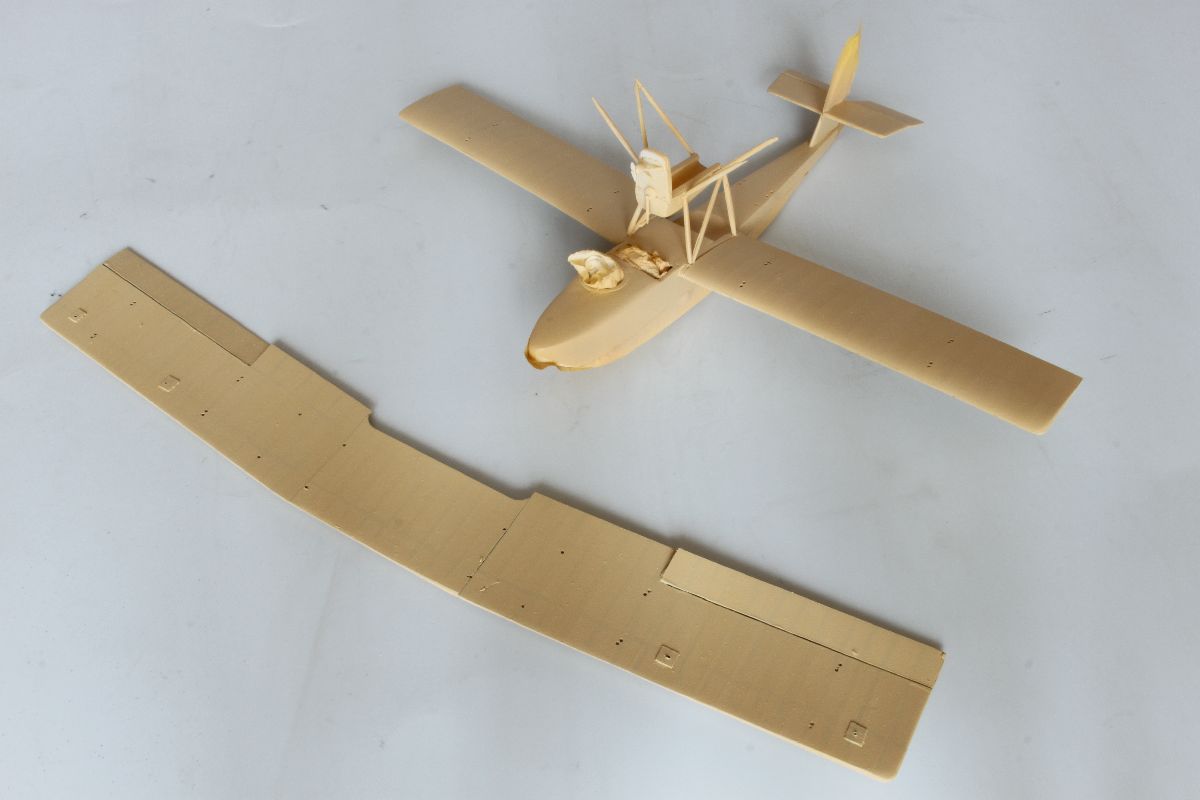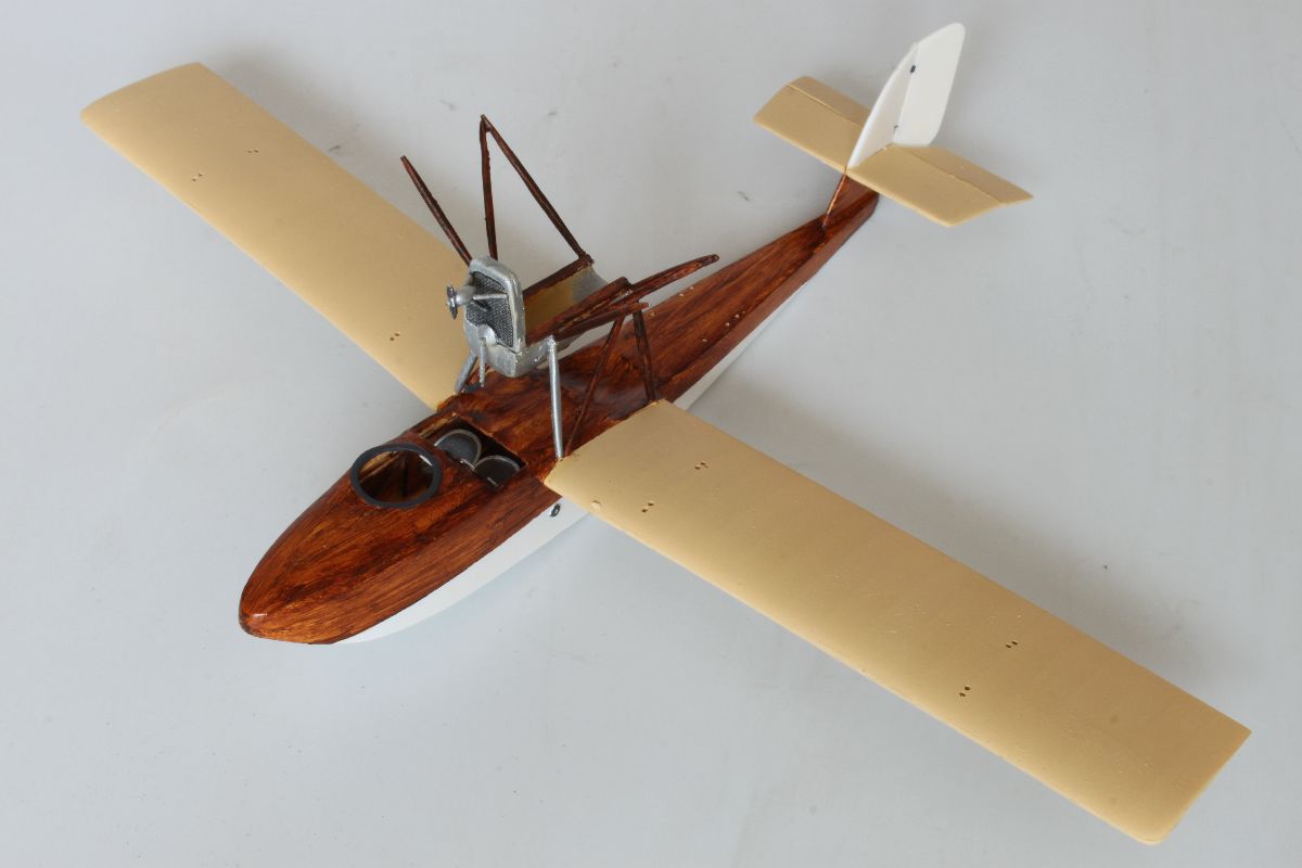 Wszystko pasowało ze sobą doskonale, jedynie użycia niewielkiej ilości szpachli wymagało miejsce łączenia połówek kadłuba w jego podłodziu. Mając gotowy kadłub, dokleiłem usterzenie. Wszystkie powierzchnie sterowe wykonałem jako wychylone. Należało naciąć szczelinę pomiędzy statecznikiem a sterem i wychylić stery pod odpowiednim kątem. W celu wzmocnienia tych elementów w szczeliny wpuściłem odrobinę rzadkiego kleju. Ster kierunku postanowiłem odciąć i wzbogacić o zawiasy, wykonane z kawałków polistyrenowego pręta. Po zakończeniu prac nad usterzeniem przykleiłem do kadłuba dolne płaty w których wcześniej nawierciłem otwory pod zastrzały i naciągi oraz przygotowany uprzednio stelaż z obudową silnika. Na tym etapie przygotowałem również górny płat, pływaki, silnik, wózek oraz pozostałe elementy. Można było zabrać się za malowanie.