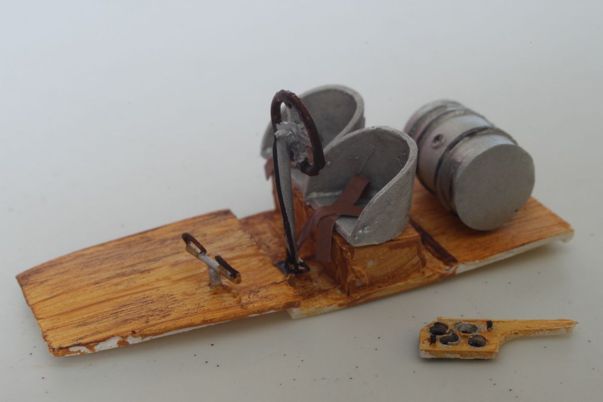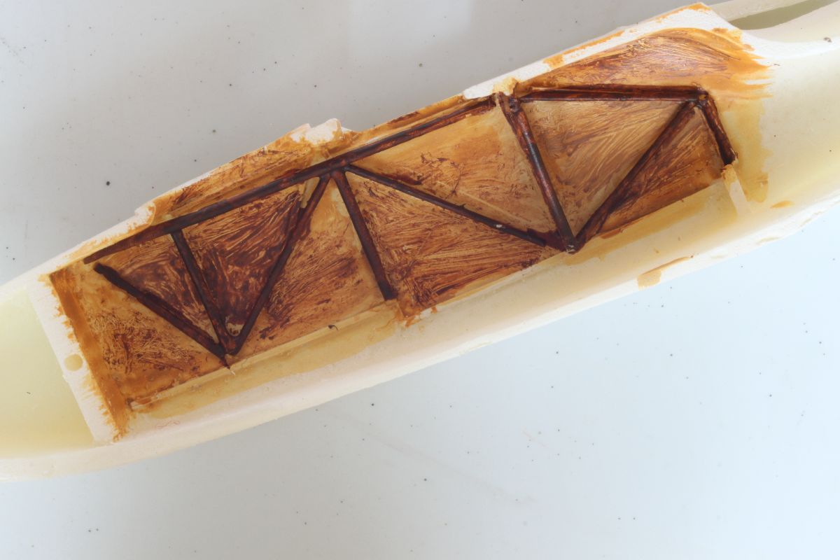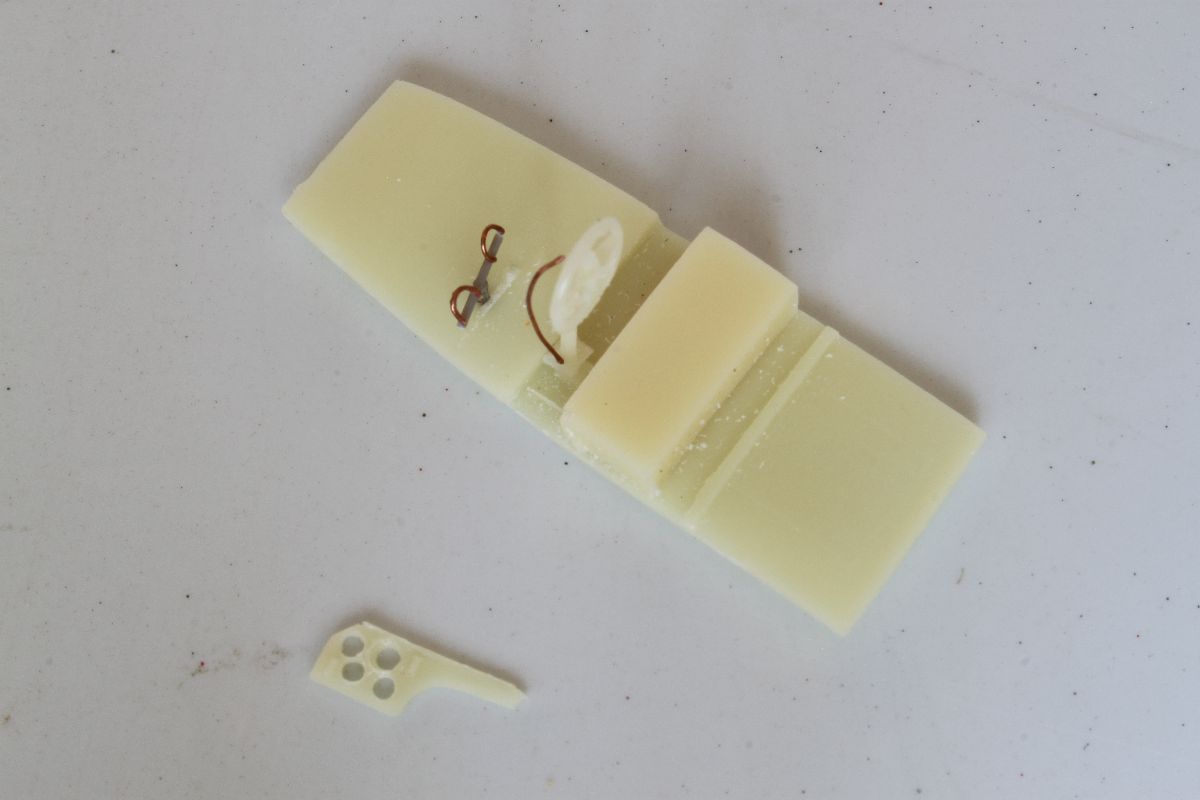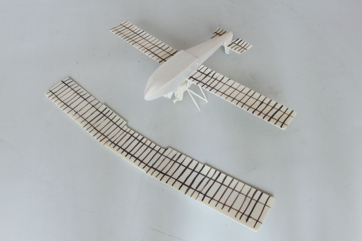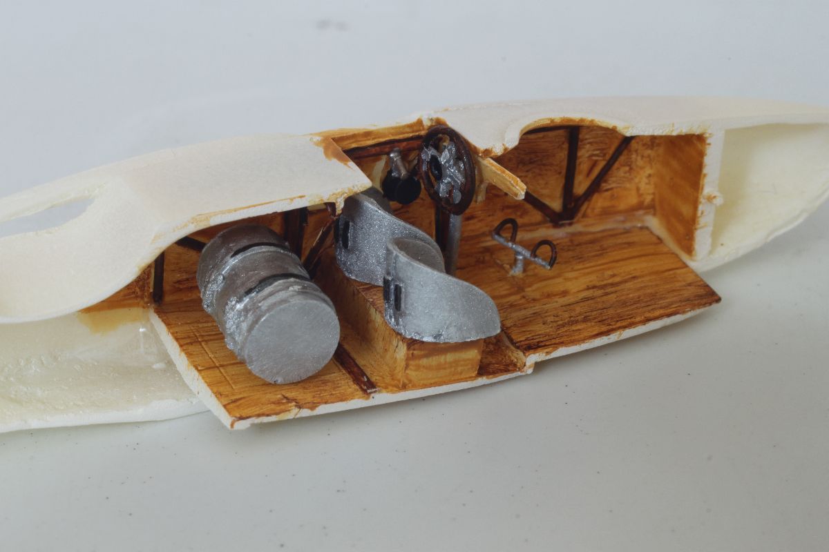 Wszystko pasowało ze sobą doskonale, jedynie użycia niewielkiej ilości szpachli wymagało miejsce łączenia połówek kadłuba w jego podłodziu. Mając gotowy kadłub, dokleiłem usterzenie. Wszystkie powierzchnie sterowe wykonałem jako wychylone. Należało naciąć szczelinę pomiędzy statecznikiem a sterem i wychylić stery pod odpowiednim kątem. W celu wzmocnienia tych elementów w szczeliny wpuściłem odrobinę rzadkiego kleju. Ster kierunku postanowiłem odciąć i wzbogacić o zawiasy, wykonane z kawałków polistyrenowego pręta. Po zakończeniu prac nad usterzeniem przykleiłem do kadłuba dolne płaty w których wcześniej nawierciłem otwory pod zastrzały i naciągi oraz przygotowany uprzednio stelaż z obudową silnika. Na tym etapie przygotowałem również górny płat, pływaki, silnik, wózek oraz pozostałe elementy. Można było zabrać się za malowanie.