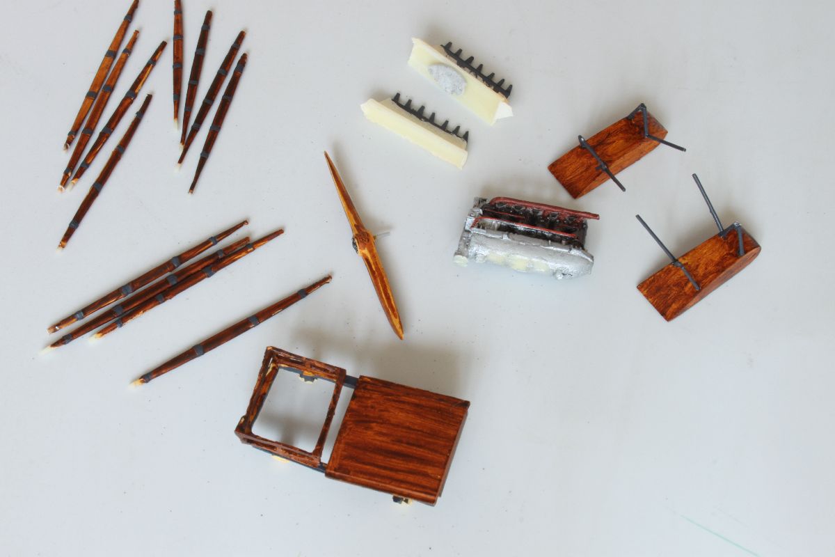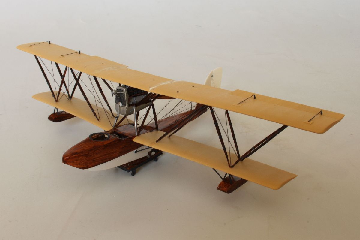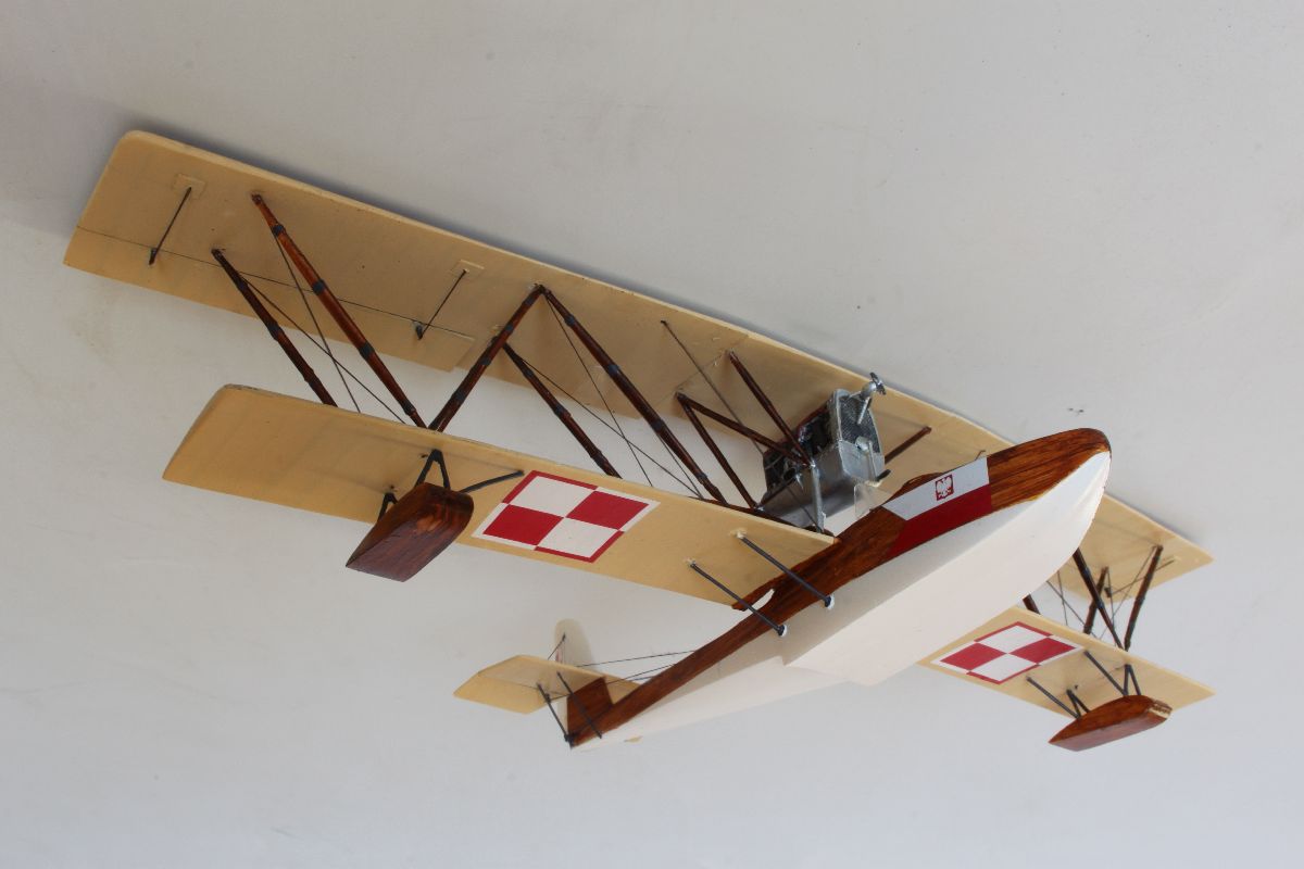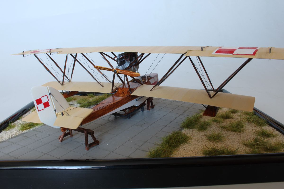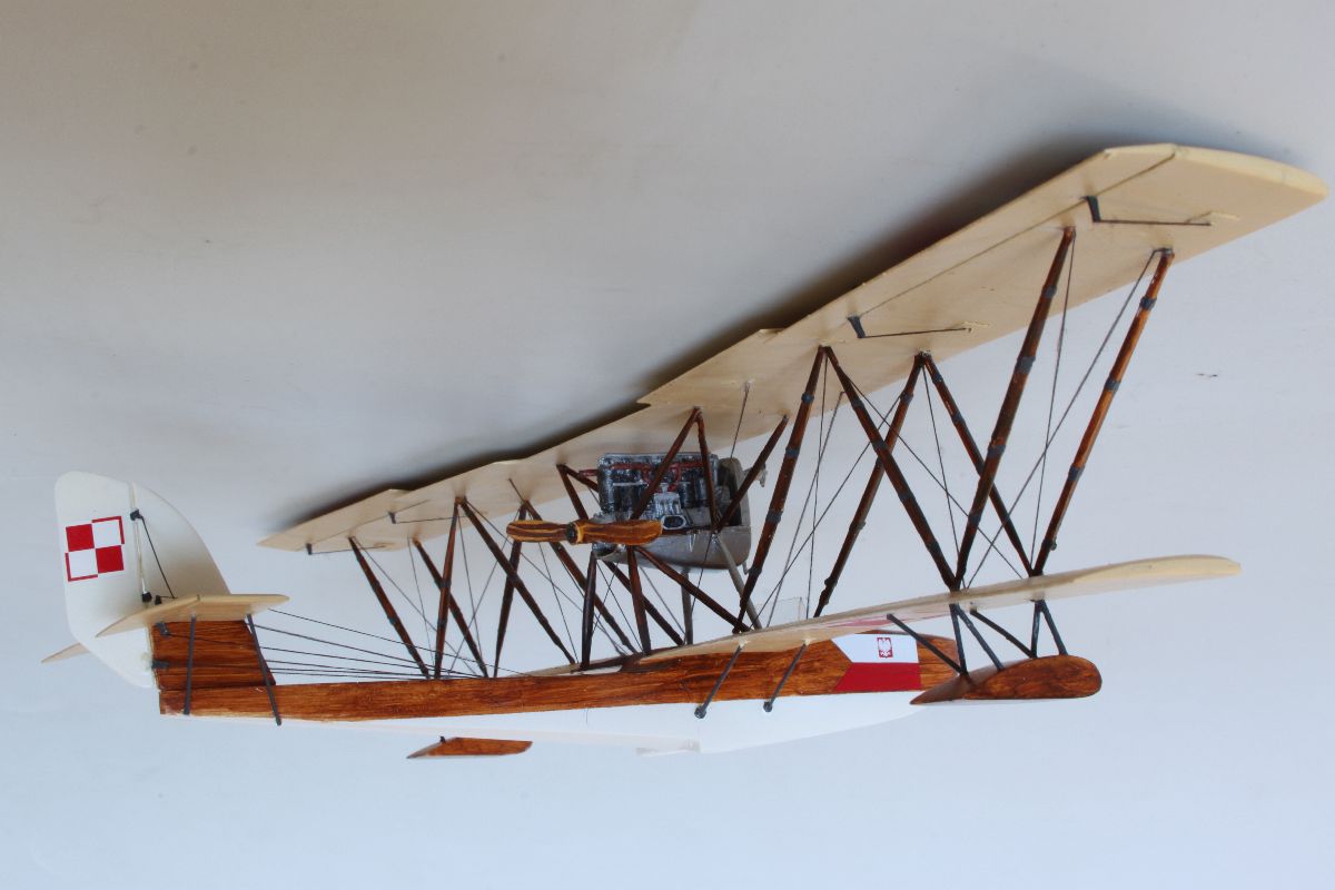 Zacząłem od pokrycia wszystkich elementów modelu podkładem w sprayu, co daje lepszą przyczepność farby. Następnie podłodzie oraz ster kierunku pomalowałem kolorem białym, używając doskonałej farby Bilmodelmaker. Jej schnięcie to kwestia kilkunastu minut, a twarda powłoka jest odporna niemal na wszystko. Mogłem zamaskować pomalowane na biało powierzchnie i nakładać kolejny kolor. Ponieważ wybrałem wariant kolorystyczny sprzed remontu w CWL, a więc był to kolor beżowy (Vallejo dark sand) z dodatkiem bieli (Italeri white). Miał on stanowić podkład pod „sklejkowy” kolor kadłuba i „płócienny” kolor płatów. Zanim jednak zatankowałem aerograf przygotowaną mieszanką na dolnych powierzchniach płatów naniosłem pędzelkiem siatkę żeber i dźwigarów. Miała ona prześwitywać spod koloru płótna. Model pomalowałem kilkoma warstwami beżowej, natomiast ostanie warstwy tej nanoszonej na płaty dodatkowo rozjaśniłem jeszcze odrobiną bieli. Farbę nanosiłem wzdłuż linii żeber, tak żeby uzyskać nieregularne ledwie widoczne cienie i delikatnie prześwitującą siatkę żeber i dźwigarów na dolnych powierzchniach płatów. Po wyschnięciu koloru bazowego przystąpiłem do malowania imitacji sklejki na kadłubie. Można to wykonać przy pomocy kilku odcieni brązu i beżu, ja zrobiłem to dwoma odcieniami farb akrylowych Vallejo – wood i dark umber. Obie nanosiłem cienkim płaskim pędzelkiem pozostawiając ślady imitujące fakturę drewna. Podobnie pomalowałem pływaki oraz zastrzały, z tym, że na tych ostatnich fakturę zrobiłem nieco ciemniejszą. Ostatnie czynności na tym etapie prac to pokrycie powierzchni sklejkowej Sidoluxem do podłóg w celu nadani delikatnego połysku, oraz pomalowanie metalizerem (Vallejo aluminium) osłony silnika wraz z chłodnicą. W kratkę tej ostatniej zapuściłem mocno rozcieńczoną, ciemnoszarą farbę.