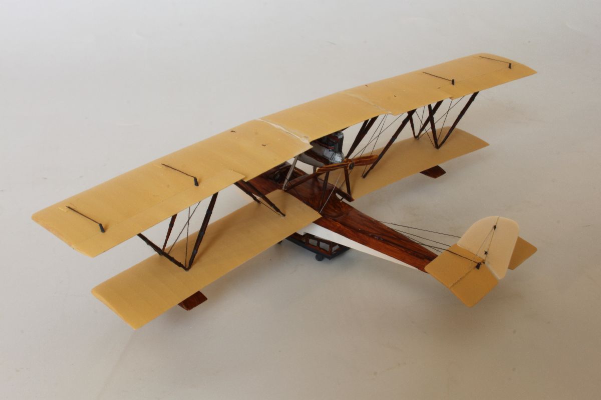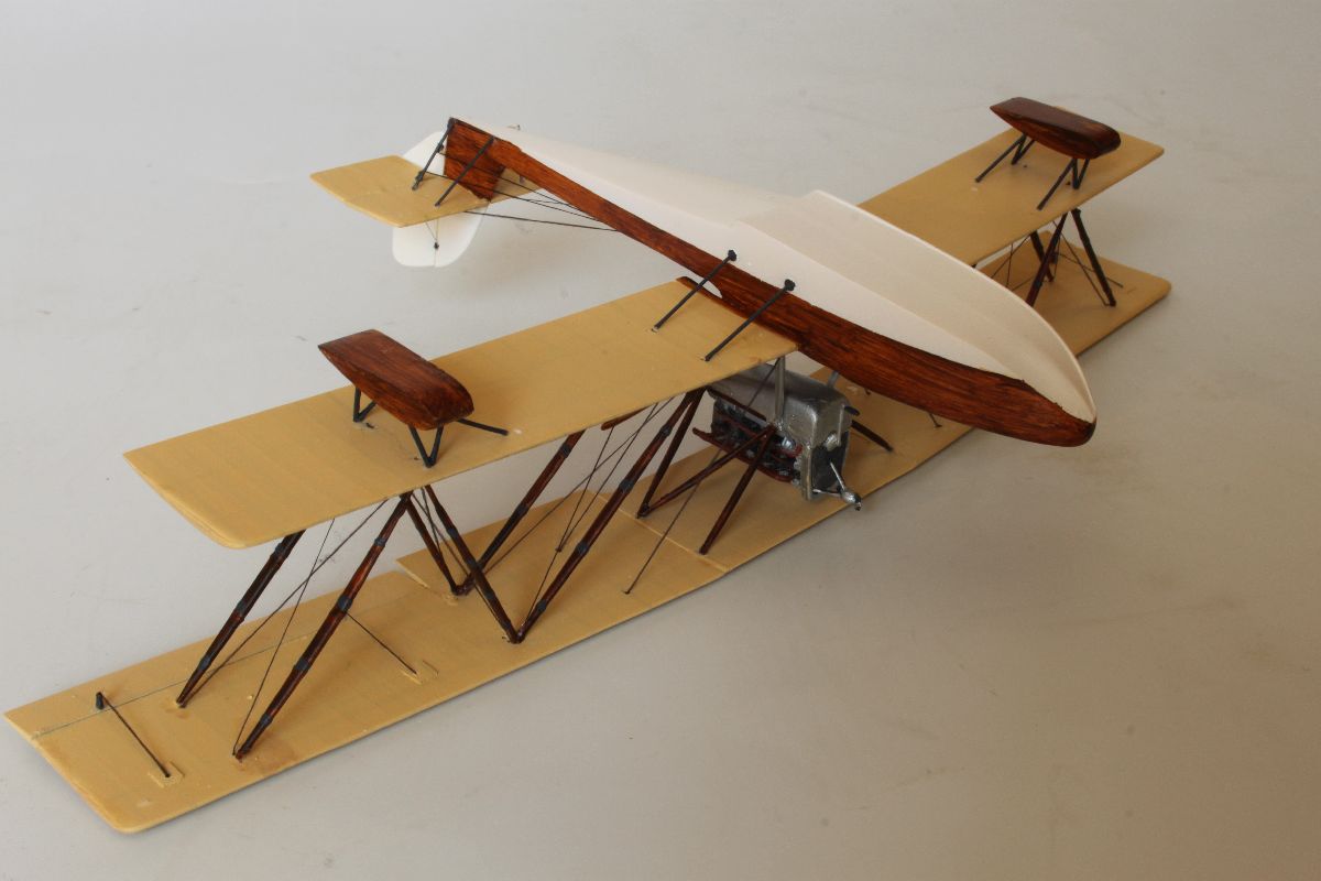 Teraz mogłem przystąpić do montażu górnego płata. Jest to bodaj najtrudniejszy etap prac przy klejeniu każdego dwupłata. Od powodzenia tej operacji zależy w dużej mierze wygląd budowanej repliki. Większość modelarzy stosuje schemat, który i ja powieliłem przy klejeniu Macchi. Zacząłem od wklejenia silnika na swoje miejsce. Potem ułożyłem górny płat na równiej powierzchni dolną powierzchnią do góry. Na nim umieściłem budowaną replikę centralnymi zastrzałami i zacząłem sprawdzać ułożenie płatów względem siebie i kadłuba, kąty wysokość itp. Kiedy byłem pewien, że wszystko jest jak należy, a bryła modelu w żadnym stopniu nie uległa zwichrowaniu, wpuściłem pomiędzy centralne zastrzały a górny płat odrobinę kleju cyjanoakrylowego i nie ruszałem go aż do zaschnięcia. Po tym jak upewniłem się, że spoina jest mocna przystąpiłem do montażu pozostałych zastrzałów. Okazało się, że są nieco za krótkie. Z tym problemem poradziłem sobie doklejając z jednej strony kawałki plastikowych prętów. Miejsce łączenia zalałem klejem, a po jego wyschnięciu obrobiłem pilnikiem nadając zastrzałom odpowiedni kształt. Zostawiłem sobie niewielki zapas, w razie potrzeby odcinając nadmiar. W ten sposób zastrzały znalazły się na swoich miejscach, a ja mogłem dokleić wszystkie drobne detale. Model został złożony w całość.