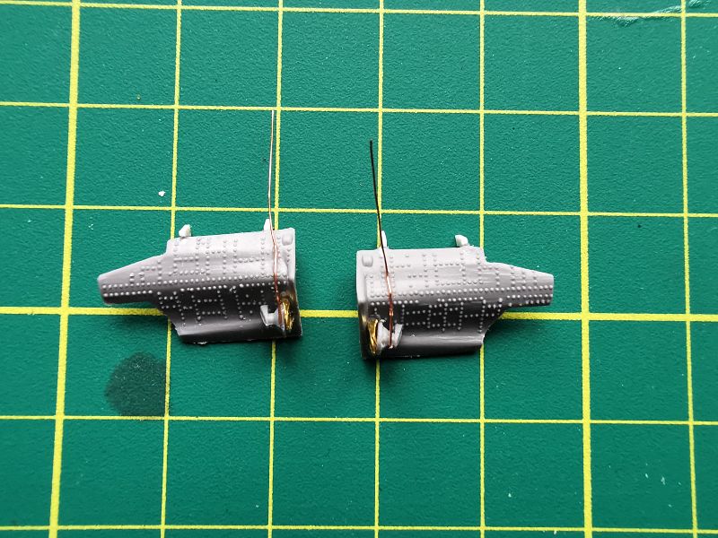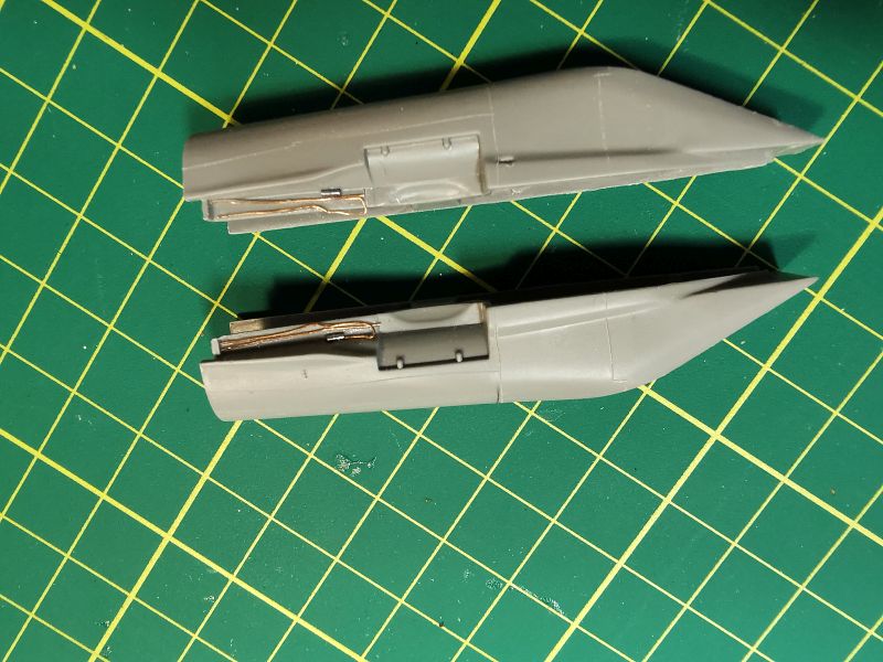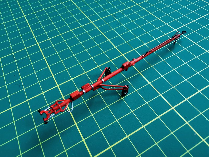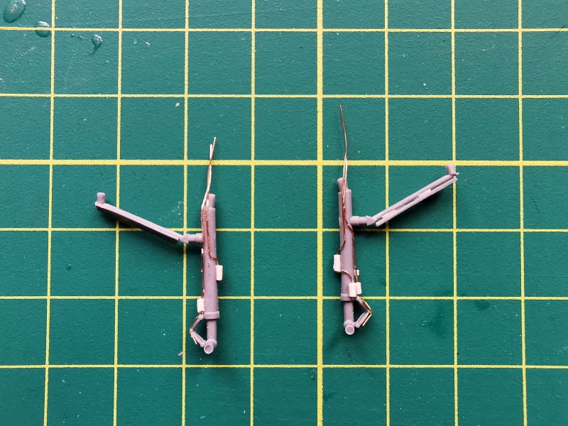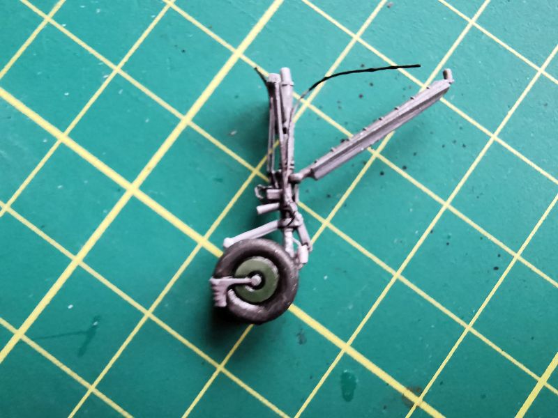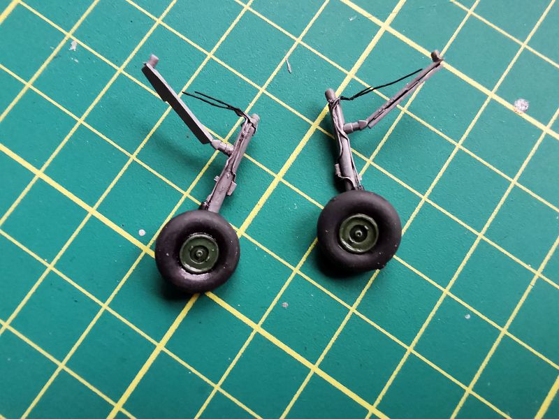 Równolegle powstawały podzespoły podwozia głównego. Golenie dostały imitację przewodów, trochę detali z Parta i trochę dorobionych we własnym zakresie na podstawie zdjęć. Pokrywy luków nowe zawiasy (zrobiłem je celowo nieco dłuższe żeby móc wygodnie operować nimi podczas malowania) oraz reflektory do lądowania wraz z okablowaniem.