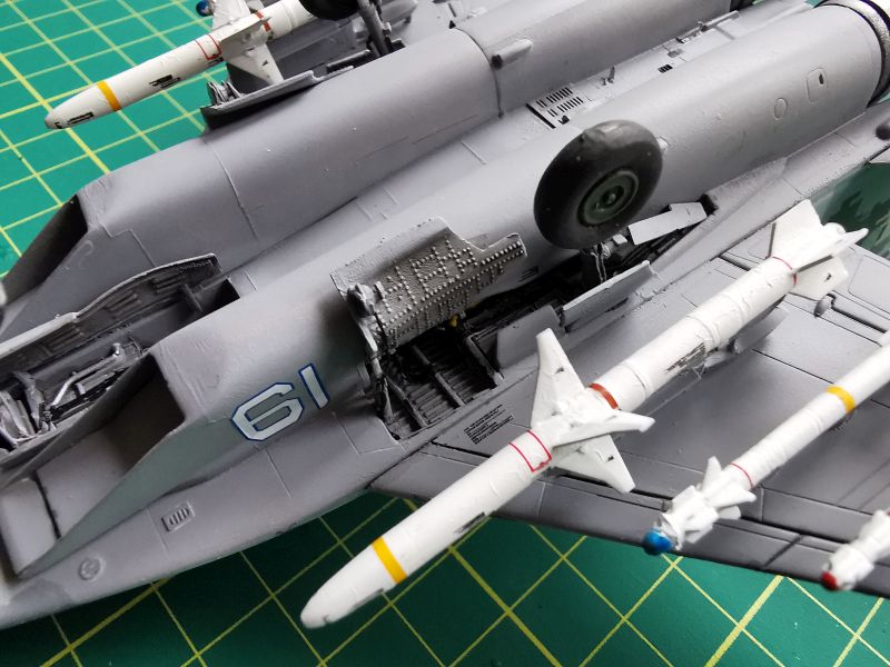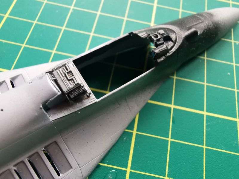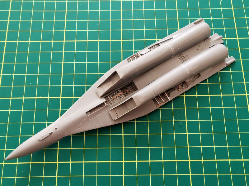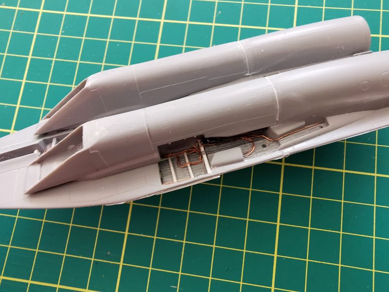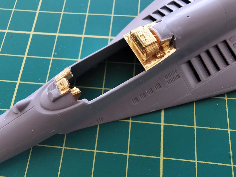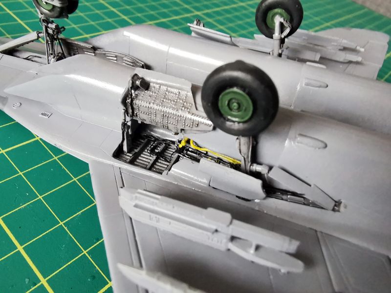 Ważne jest także pewne założenie. Wiadomo bowiem, że ukraiński zestaw ma już kilka lat i nie można podchodzić do niego tak, jak do zestawów produkowanych współcześnie. Widziałem już relacje z budowy w którym użyto ogromnych ilości szpachli, którą potem mozolnie szlifowano, wyrównywano i dokładano sobie mnóstwo upierdliwej i zupełnie niepotrzebnej pracy. Ja skupiłem się na dokładnym wycięciu i oczyszczeniu z na szczęście nie licznych nadlewek podstawowych elementów modelu, dokładnie górnej i dolnej części kadłuba oraz obu chwytów powietrza. Potem nastąpiło wielokrotne sprawdzanie wzajemnego spasowania tych części i korekty miejsc łączenia. Pracy pilnikiem i kostką ścierną znaczenie mniej, ale miałem pewność, że użycie szpachlówki ograniczę do niezbędnego minimum. Dopiero teraz mogłem zabrać się za to, co jest widoczne na powyższych zdjęciach. Czyli luki podwozia. Luk podwozia przedniego dostał jedynie imitację przewodów instalacji, zaś komory podwozia głównego wydały mi się zbyt płytkie. Pogłębiłem jedynie wnęki na koła, na szczęście miękki plastik użyty do produkcji modelu znacznie ułatwił sprawę. Wykonałem na nowo boczne ścianki z kawałów hipsu, zaś stropy to oryginalne elementy wzbogacone o kilka detali konstrukcji no i oczywiście przewody. Trochę przewodów przykleiłem także to ścianek luków na wlotach powietrza. Dzięki temu, że wloty zostały już wcześniej dobrze spasowane z dolną częścią kadłuba ich wklejenie było bezproblemowe. Nieco szpachlówki nałożyłem jedynie w łączenia wlotów z gondolami silników. Pracowałem wtedy także nad kabiną, czyli wkleiłem odpowiednie fototrawione detale z blaszki Parta w odpowiednie miejsca w górnej połówce kadłuba.