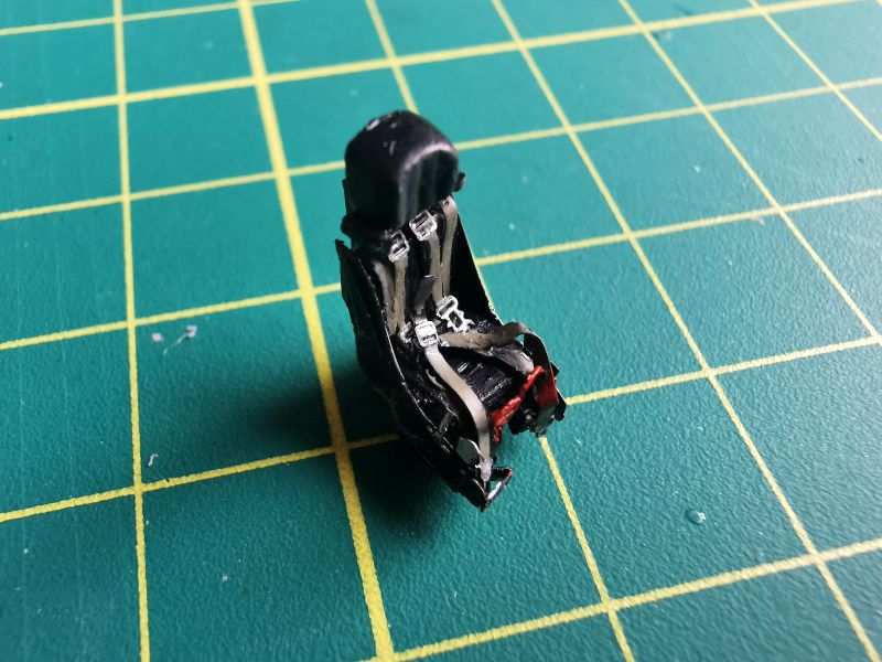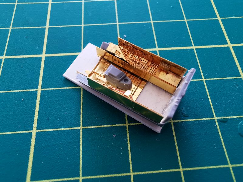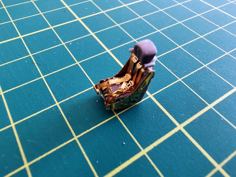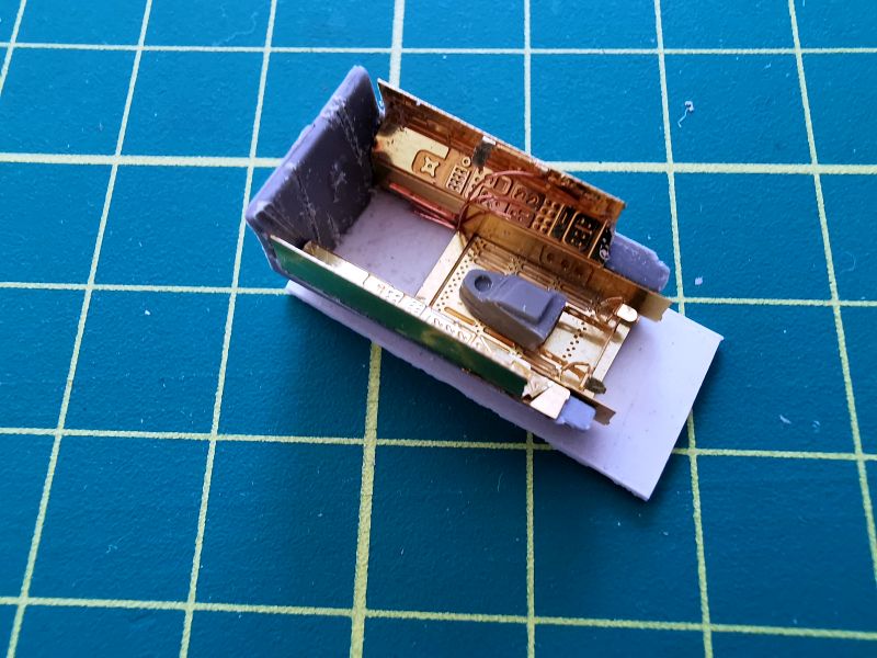 Żeby dobrodziejstwo z blaszki Parta wpasować w wannę kokpitu, musiałem usunąć z niej podłogę i dokleić nową z polistyrenu a na niej osadzić fot otrawioną i dopiero na niej kolumnę drążka sterowego. Znaczenie mniejszych akrobacji wymagało wpasowanie paneli bocznych. Trzeba pamiętać o tym, że Part opracował swoje blaszki pod zupełnie inny zestaw, bezmyślne wklejanie zakończy się katastrofą. Uczulam na przednie części paneli w miejscu gdzie wejdzie tablica przyrządów. Ja nie zastosowałem fot otrawionej ponieważ zauważyłem pewne równice pomiędzy wersją 9.12 (Part/ Italeri) a 9.13 (ICM). Zmodyfikowałem nieco tę z zestawu, wykorzystując jedynie cześć detali Parta. Za to fotel okleiłem wszystkim, co było. Oczywiście musiałem nieco zeszlifować boki, aby bezproblemowo wszedł na swoje miejsce w kokpicie. W kilku miejscach dokleiłem też trochę przewodów, zaobserwowałem je na zdjęciach oryginału.