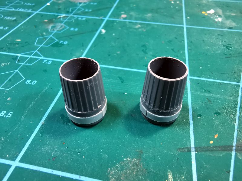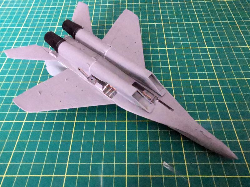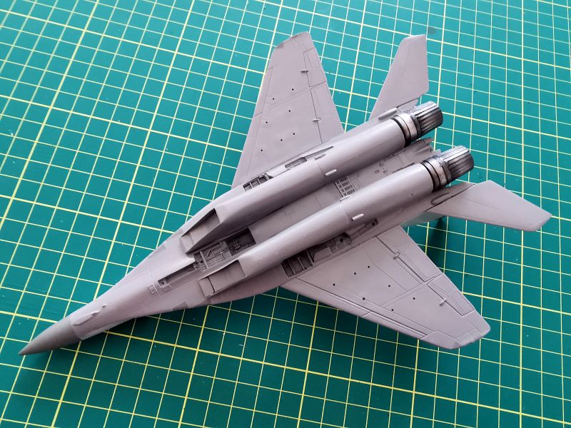 Wraz z montażem podwozia, na swoje miejsce trafiły także dysze silników. Wykorzystałem te z zestawu, uzupełniając tylko o detale Parta, które i tak ledwie widać w środku. Uzupełniłem je tyko o charakterystyczne pierścienie w częściach przykadłubowych. Malowanie przebiegało następująco – najpierw czarny, potem srebrny, następnie srebrny w dodatkiem czarnej nanosiłem go cienką kreską wzdłuż linii. Na samym końcu końcówki dysz oraz kilka paneli potraktowałem odrobiną srebrnej z dodatkiem niebieskiej – chodziło mi o efekt wyżarzonego metalu. Montaż podwozia odbył się bez większych sensacji, musiałem tylko nieco rozwiercić otwory montażowe.