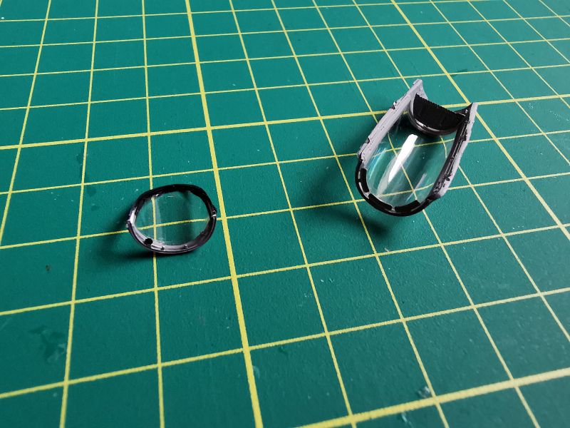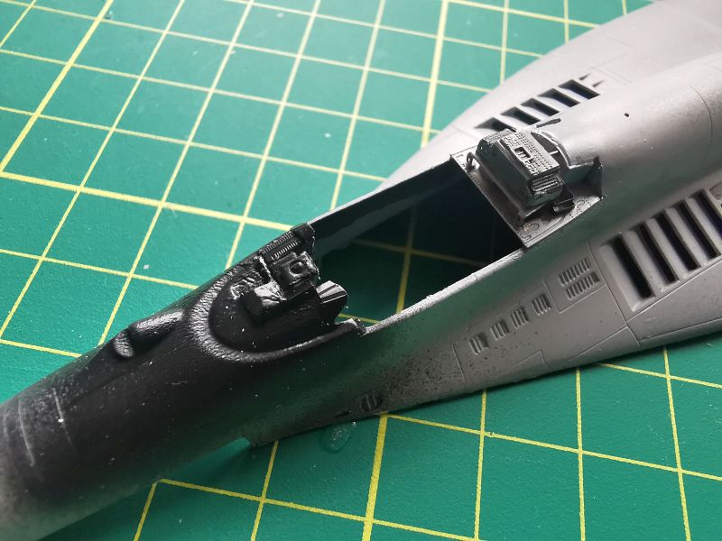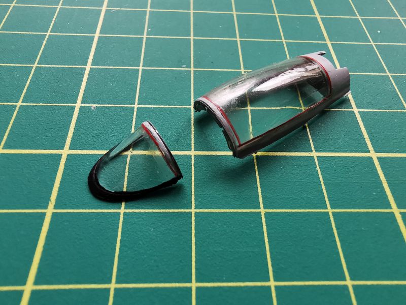 Osłona kabiny była ostatnim etapem prac nad modelem. Dużo dały tu detale Parta. Przed wklejeniem wiatrochronu zamontowałem zespół celownika. Na zdjęciach wyraźnie widać, że w miejscu styku szyby z ramą jest coś w rodzaju uszczelki w kolorze ciemnoczerwonym lub brązowym. Ponieważ malowanie tego pędzelkiem było dla manie wykonalne, wykorzystałem pasek kalkomanii w odpowiednim kolorze, który przyciąłem ostrym nożykiem do odpowiednich rozmiarów. Z nakładaniem było trochę zabawy, trzeba było użyć dość sporo płynu do kalek, ale efekt w sumie niezły.