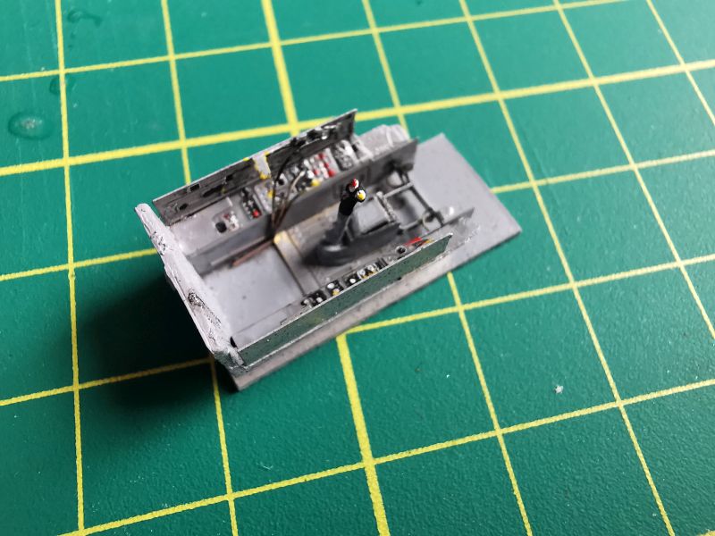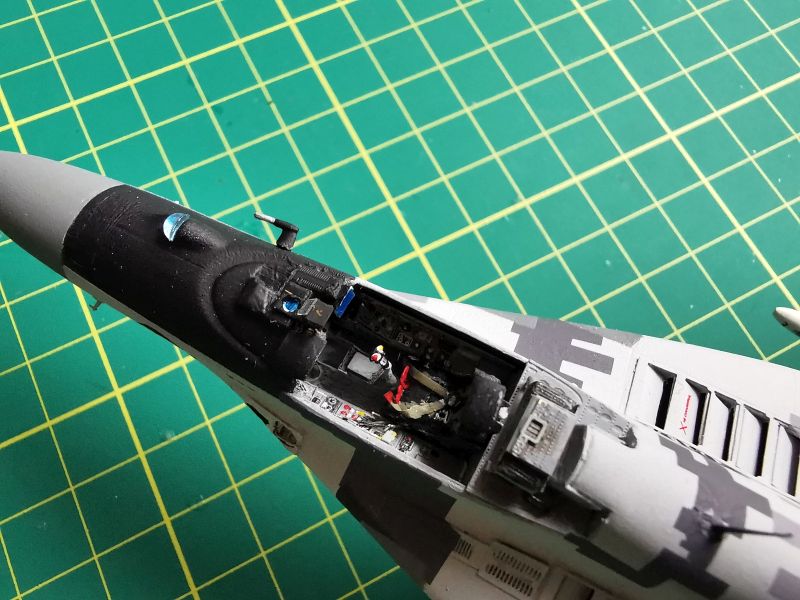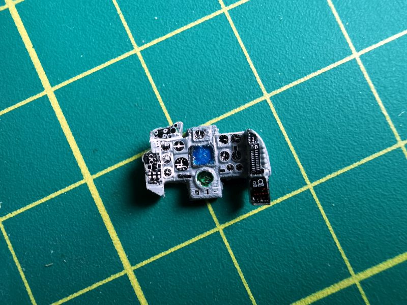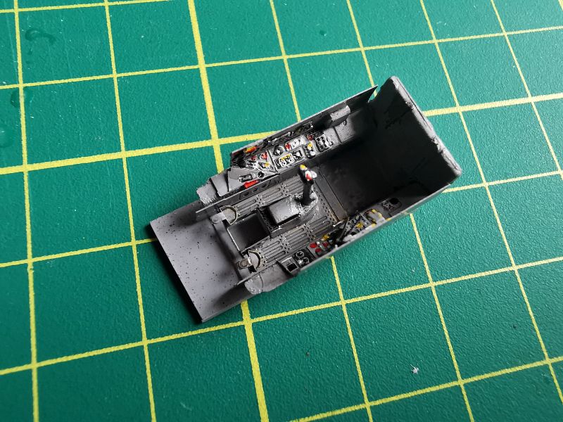 Kokpit następnie pomalowałem. Do budowy tego modelu używałem farb Bilmodelmakers i kokpit nie był tu wyjątkiem. Odcień szarego dobrałem na podstawie zdjęć. Drobne detale tradycyjnie malowałem już pędzelkiem farbami akrylowymi różnych producentów. Ponieważ kalkomania na tablicę przyrządów nieco rozminęła się z rozkładem przyrządów na moje tablicy, pociąłem ja żyletką na poszczególne zegary i wskaźniki i pojedynczo umieszczałem tam, gdzie należało. Na koniec kokpit potraktowałem washem.