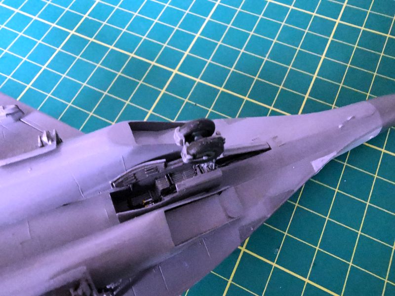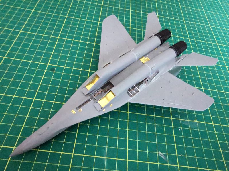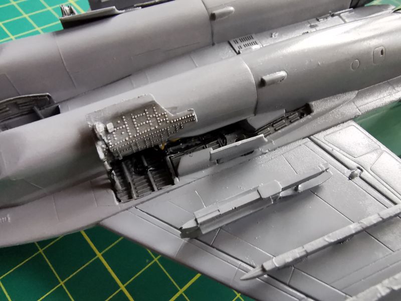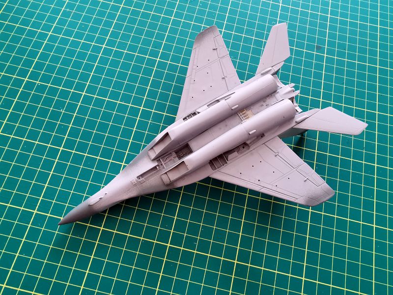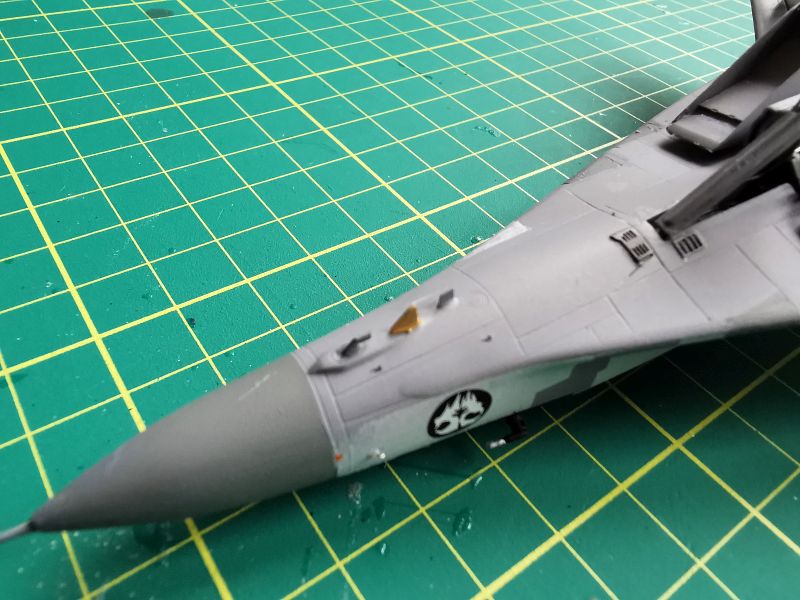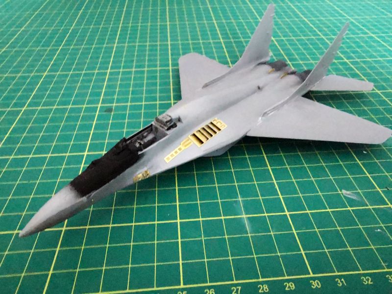 Po wklejeniu kokpitu na swoje miejsce i nałożeniu odrobiny balastu w cześć nosową, model został złożony w całość. Kadłub miałem spasowany już wcześniej, więc ze złożeniem go w całość nie miałem problemu. W miejsca łączenia wpuściłem klej cyjanoakrylowy, który posłużył mi za szpachlówkę. Dzięki temu szlifowanie i polerowanie odbyło się zupełnie bezstresowo. Czynność tę zakończyłem nacięciem zeszlifowanych linii podziału. Skrzydła i usterzenie także zostały odpowiednio przygotowane do montażu. Spasowanie wielokrotnie sprawdzone przed montażem. Po wklejeniu wystąpiły w kilku miejscach delikatne szczeliny, ale wypełniłem te akrylową szpachlówką Vallejo, której nadmiar usunąłem patyczkiem higienicznym i zwilżonym w wodzie pędzelkiem. Prace nad płatowcem zakończyłem montując większość fototrawionych detali z Parta. Wszelkie anteny oraz czujniki zostawiłem na koniec, po pomalowaniu i nałożeniu kalkomanii.