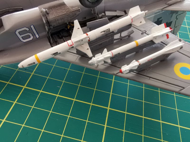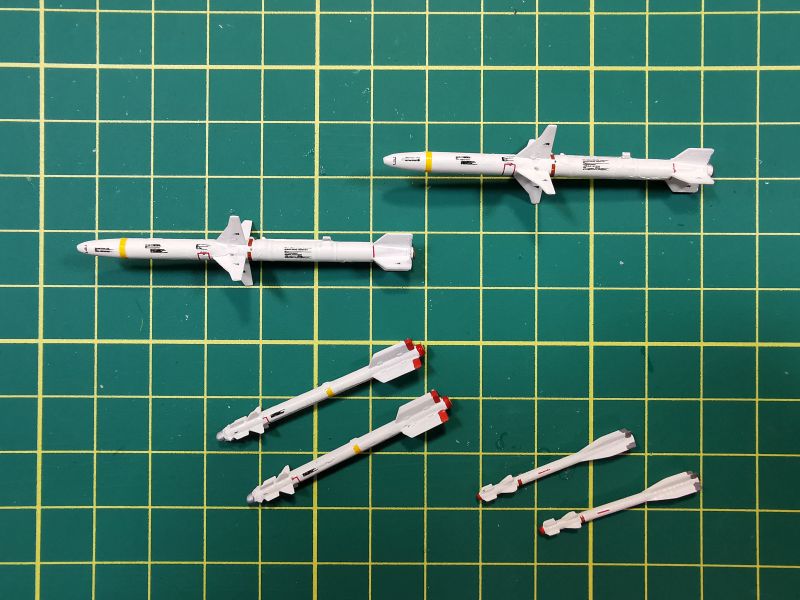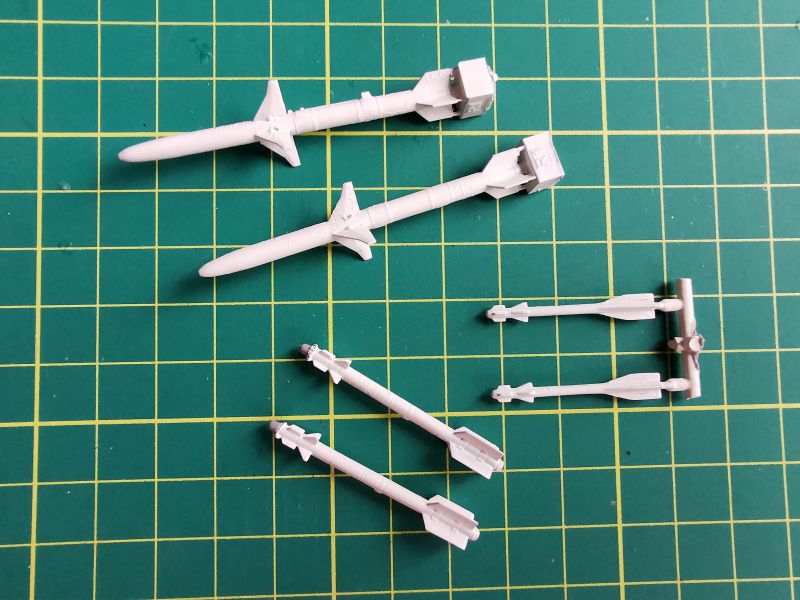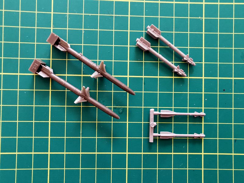 Na zdjęciach powyżej widać, że moja miniatura ma już założony komplet podwieszanych środków bojowych. Wspomniałem powyżej, że chciałem aby mój model miał podwieszone pociski rakietowe AGM-88 HARM i w tym celu zamierzałem wykorzystać żywice Eduarda. Czeski zestaw ma także adaptery i to w dwóch wersjach. Pozostało tylko wykonać tylko odpowiednie belki dla tych podwieszeń. Tu pojawił się problem, bo na zdjęciach nie wiele było widać. Pewną pomocą okazała się zapowiedź firmy ResKit, która właśnie wprowadziła do swojej oferty pociski HARM z adapterami i belkami do MiGów-29. Początkowo chciałem je zamówić, ale kiedy zorientowałem się, że dostanę je dopiero w połowie marca, zdecydowałem, że zrobię je samodzielnie, wzorując się na zdjęciach zestawu ResKita. Efekt myślę nie najgorszy, co widać powyżej. Pozostałe belki i pociski pochodzą z zestawu, wystarczyło je tylko porządnie oszlifować. Pomalowane i oklejone kalkomaniami pociski znalazły się na swoich miejscach w modelu.