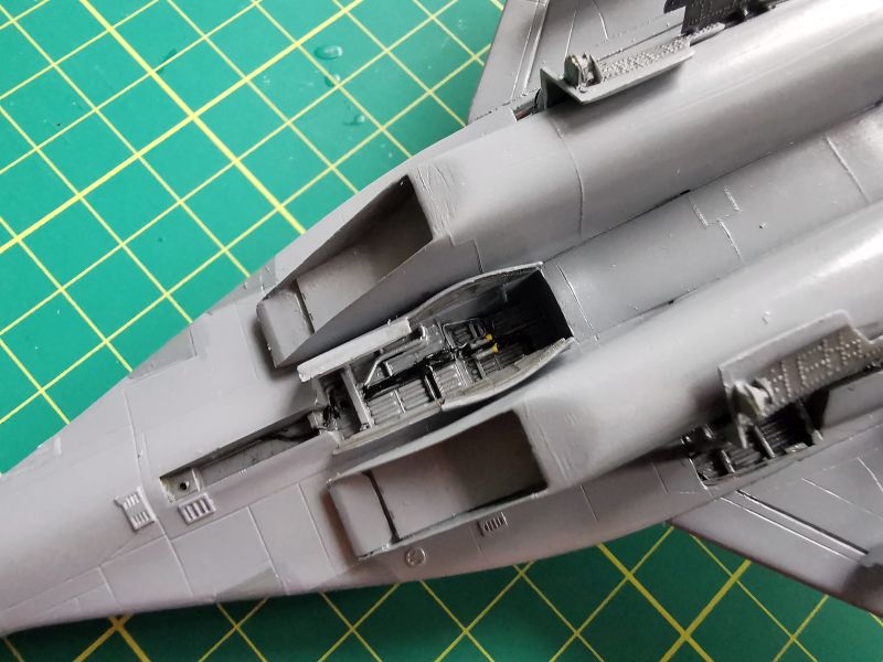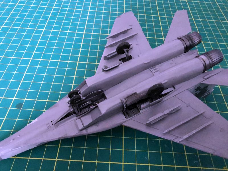Było to podwozie. Farbkami akrylowymi pomalowałem takie rzeczy jak piasty kół, opony, przewody i temu podobne detale. Wkleiłem na swoje miejsca pokrywy luków dopasowując uprzednio długość ich zawiasów, poprawiłem malowanie i potem wszystko potraktowałem czarnym washem. Potem odłożyłem model do całkowitego wyschnięcia.
