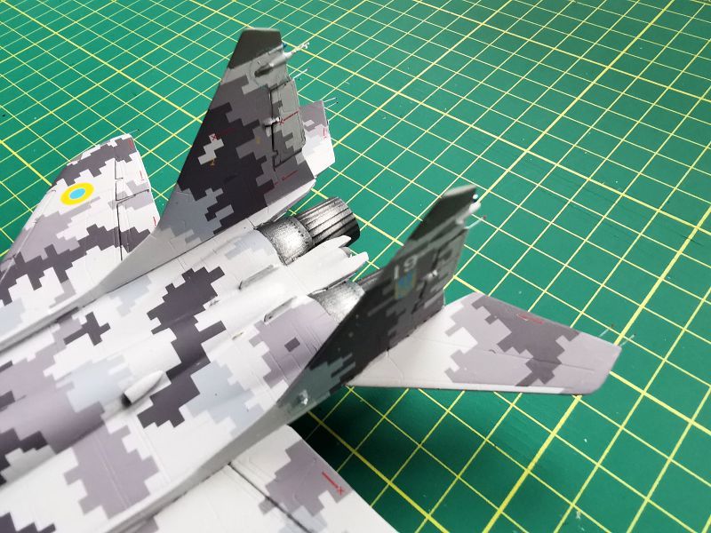 Po ich wyschnięciu i podmalowaniu kilku miejsc, które tego wymagały nałożyłem całą resztę kalkomanii. Pomimo, że producent wyposażył modelarzy w trzy komplety numerów w różnych kolorach, ja zdecydowałem się białą „19” widniejącą na pudełku i schemacie malowania. Podejrzewam, że ten numer nie jest przypadkowy a mi zależało, żeby samolot należał do jednej z eskadr odpowiedzialnych za obronę powietrzną Kijowa. Nie będę się tu wdawał w szczegóły odnośnie jednostki i bazy, pomimo że jest to wiedza ogólnie dostępna to jednak po co ją powielać. Nie jest jeszcze ku temu pora. Myślę, że za jakiś czas cała wiedza na temat Ducha z Kijowa będzie ogólnie dostępna i będzie możliwe dokładne odtworzenie malowania samolotu na którym latał. Zaobserwowałem natomiast, że ukraińskie MiGi w pixelowym kamuflażu są niemal nieskazitelnie czyste, więc ślady eksploatacji ograniczyłem jedynie do zapuszczenia na czarno linii wszystkich powierzchni sterowych.