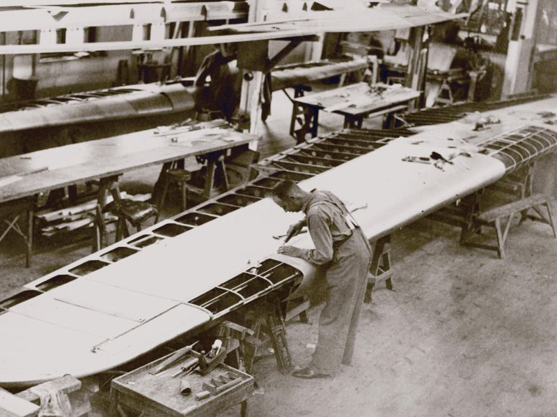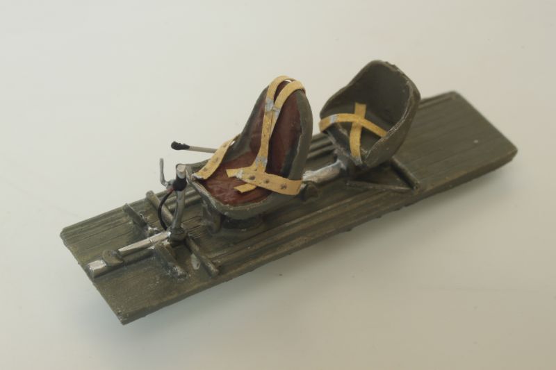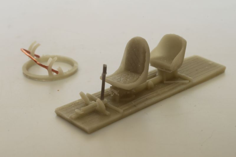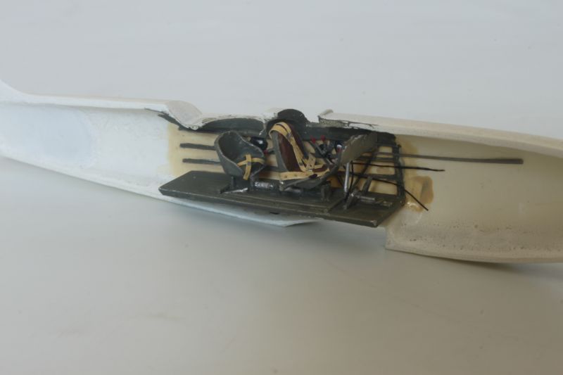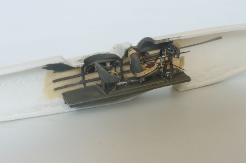 Wnętrze kabiny skleiłem w zasadzie zgodnie z instrukcją, uzupełniając fotel o pasy wykonane z papieru i kilka przewodów. Potem malowanie. To co w oryginale było kryte płótnem dostało kolor beżowy, zaś sama konstrukcja płatowca została pomalowana kolorem RLM 002 z palety Italeri. Po zakończeniu malowania kabiny, mogłem skleić kadłub w jedną całość i po obróbce miejsc łączenia wkleić dolny płat i usterzenie. Wszystkie powierzchnie sterowe postanowiłem wykonać jako wychylone. W tym celu wyciąłem lotki oraz ster wysokości (ster kierunku był już oddzielony fabrycznie) i wkleiłem pod odpowiednim kątem, dodając wykonane we własnym zakresie mechanizmy sterujące. Lotki uzupełniłem ponadto o zawiasy.