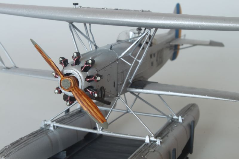 Mogłem się teraz zająć kluczowym etapem budowy repliki, a mianowicie montażem górnego płata i pływaków. Ponieważ model miał nosić jednokolorowy kamuflaż postanowiłem skleić go w całość przed malowaniem. Wklejanie górnego Plata zawsze jest zadaniem trudnym, zaś w przypadku replik żywicznych dodatkowym utrudnieniem jest konieczność indywidualnego dopasowywania poszczególnych zastrzałów pod względem kąta nachylenia oraz długości. Fokker rodem z Gdyni nie jest tu wyjątkiem i nie jest to w żadnym wypadku brak dbałości producenta, po prostu ta kategoria modeli tak ma. W przypadku piramidki i zastrzałów centralnych wszystko było w porządku, po ich zmontowaniu i doklejeniu wykonanych z cynowego drutu przewodów paliwowych, dokleiłem górny płat, dbając o zachowanie właściwej geometrii. Zastrzały przy końcach płatów okazały się natomiast nieco zbyt krótkie. Na szczęście producent dołączył dość dużą ilość zastrzałów do pozostałych wersji, które wykorzystałem, doklejając w odpowiednie miejsca gęstym klejem, który po wyschnięciu posłużył mi równocześnie za szpachlówkę. Po docięciu do właściwych rozmiarów wkleiłem zastrzały na swoje miejsca. Drobna uwaga dla dyżurnych krytykantów – przeróbka zastrzałów włącznie z wklejeniem ich na miejsce zajęła mi około 30 minut. Kolejną operacją było przyklejenie do kadłuba pływaków. Również należało uważać aby model się nie rozjeżdżał w żadną stronę. Replika była w zasadzie gotowa do malowania. Zanim to jednak nastąpiło delikatnie dokleiłem przednią część osłony silnika i pomalować ją razem z modelem, a potem zdemontować na czas montażu silnika. Po zamaskowaniu obu kabin całość pokryłem podkładem Citadela, żeby po wyschnięciu potraktować model metalizerem Alluminium Light z palety Bilmodelmaker. Po 10 minutach od zakończenia malowania mój Fokker był suchy, mogłem zdjąć maskowanie i przystąpić do dalszych prac.