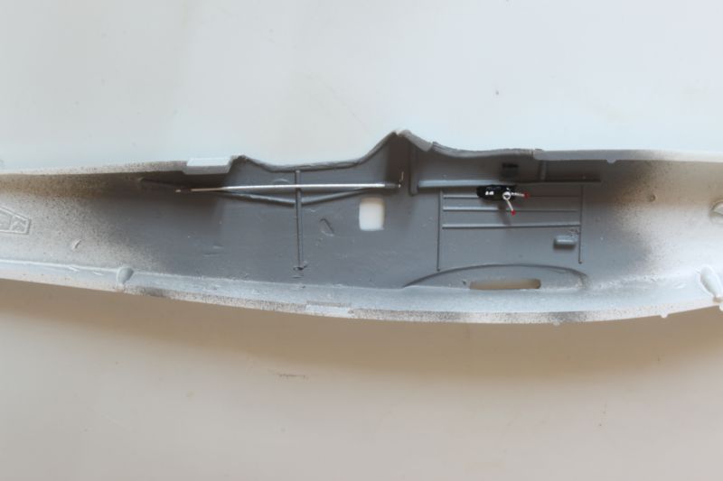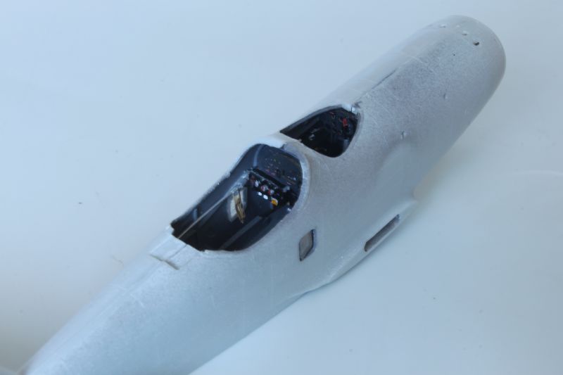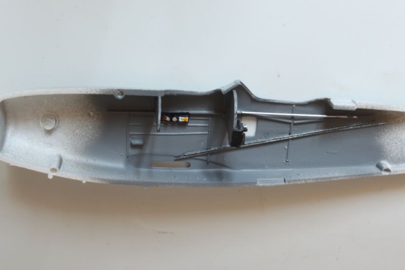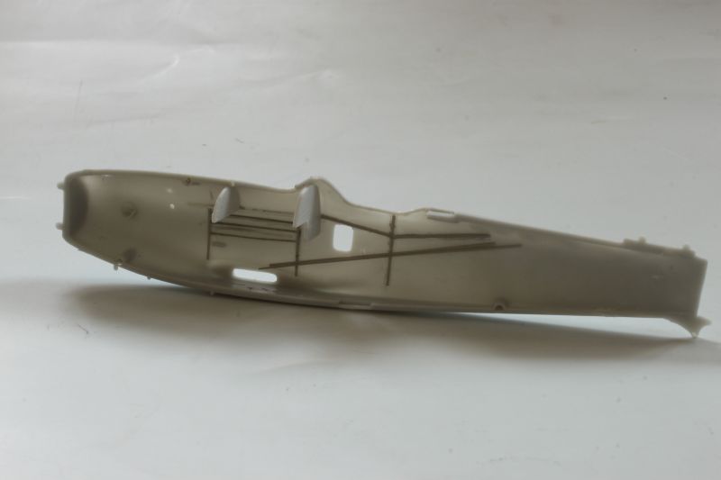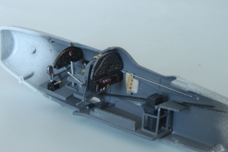 Zatem do roboty. Zacząłem od poprawienia dość prostego kokpitu. Bazując na tym, co znalazłem w sieci z kawałków tworzywa i polistyrenowych prętów odtworzyłem wewnętrzną konstrukcje płatowca w obrębie kokpitu. W ten sposób wykonałem wyposażenie. Potem całość została pomalowana, a na końcu wkleiłem pasy wykonane z cienkiego papieru pomalowanego odpowiednim kolorem oraz tablice przyrządów firmy YahuModel, co znacznie podniosło estetykę kokpitu. Od siebie dodałem wykonany od podstaw aparat fotograficzny.