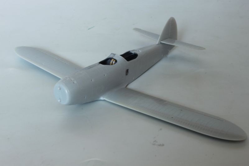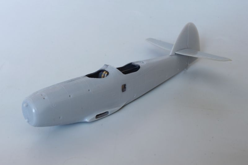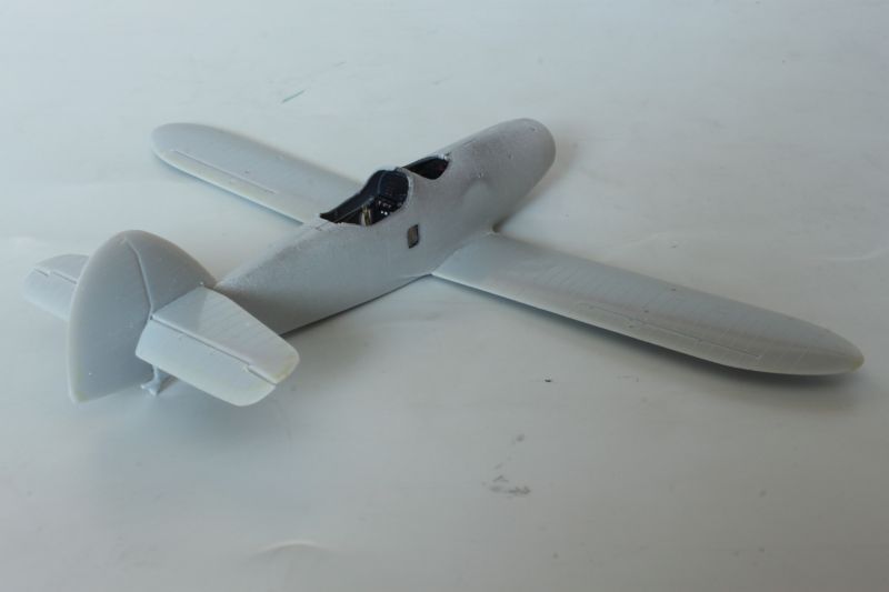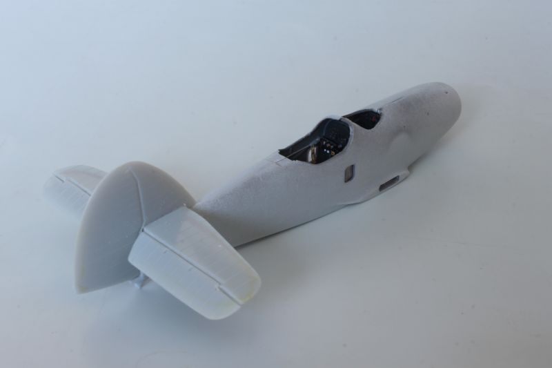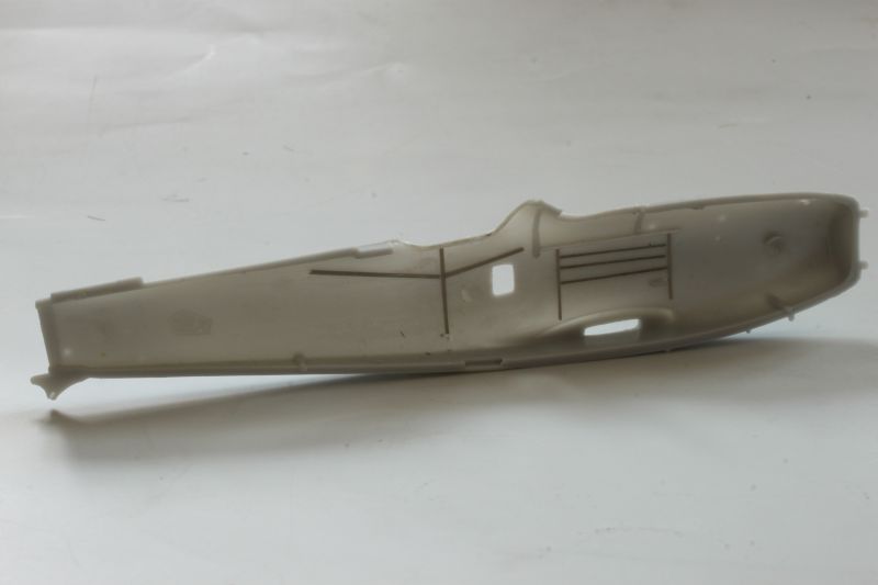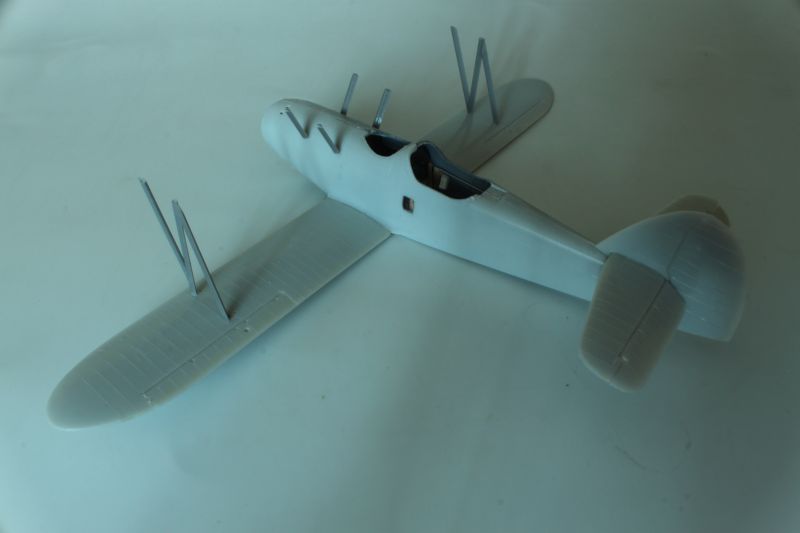 Mogłem skleić z sobą obie połówki kadłuba. Modele KP były zazwyczaj dobrze z sobą spasowane, więc ze sklejeniem nie było specjalnych problemów. Musiałem tylko uważać przy obróbce miejsc łączenia, aby nie uszkodzić delikatnej faktury kadłuba, która przecież była wypukła. Na tym etapie dokleiłem usterzenie – poziome w pozycji wychylonej oraz dolny płat.