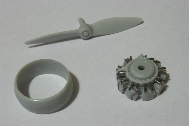 Kolejnym etapem było odtwarzanie wszelkiej maści wsporników i zastrzałów, ponieważ mój zestaw był ich swego czasu pozbawiony. Użyłem do tego celu profili firmy Palsticrust (Dzięki Tomek!!!) oraz polistyrenowych prętów. Łatwo nie było, ale dałem radę. Zazwyczaj główne zastrzały pod górny płat montuje już kiedy jest on osadzony na wspornikach kadłubowych, ale w tym wypadku musiałem odtworzyć od zera charakterystyczne N-ki i wygodniej było to robić na dolnym płacie, przymierzając od czasu do czasu górny płat. Popracowałem również nad silnikiem, który dostał nowe przewody i kolektory spalin, jego osłoną i śmigłem. Sporo zabawy było z obrobieniem tego wszystkiego - formy straszliwie poprzesuwane.