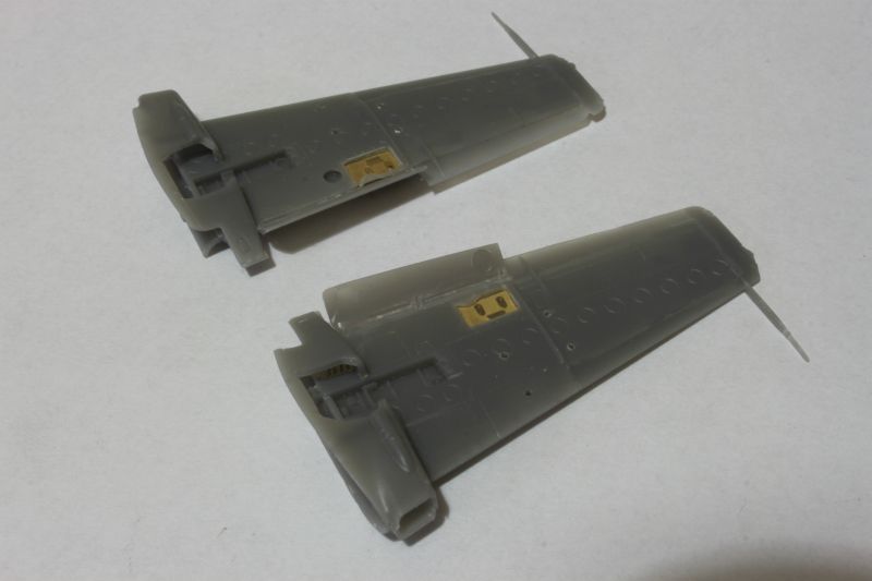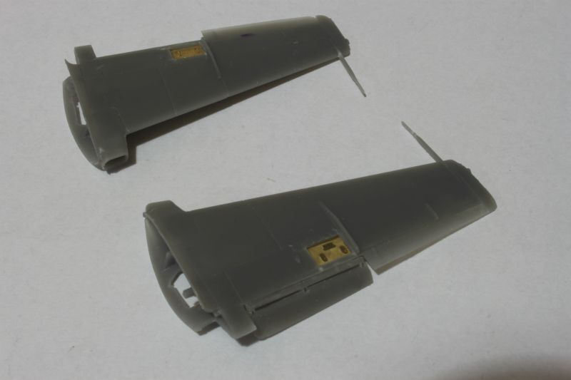 Ma pierwszy ogień poszły płaty, oczywiście zamontowałem klapy jako wychylone. Muszę przyznać, że wykonanie tego detalu zrobiło na mnie duże wrażenie, każda klapa ma delikatne zawiasy, które wspaniale wyglądały już na próbnych formach, można sobie wyobrazić co będzie w produkcie finalnym, bardzo pozytywne wrażenie zrobiły na mnie również, bardzo cienkie krawędzie spływu płatów. W budowanej replice postanowiłem wykorzystać fototrawione hamulce aerodynamiczne i zamontować je w pozycji wychylonej. W tym celu należało wyciąć w odpowiednim miejscu otwory w płatach. Problemu również tu nie było, ostry nożyk z Olfy bez problemu poradził sobie z cienkimi ściankami. Po obrobieniu pilnikiem powstałych ścianek dokleiłem fototrakwki uzyskując bardzo zgrabne wnęki pod hamulce. Te ostanie wraz z siłownikami postanowiłem wkleić dopiero po pomalowaniu modelu.