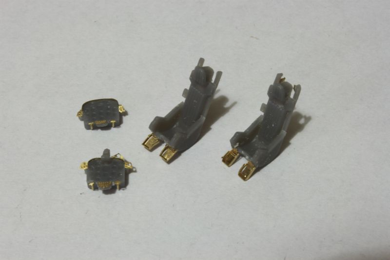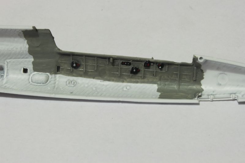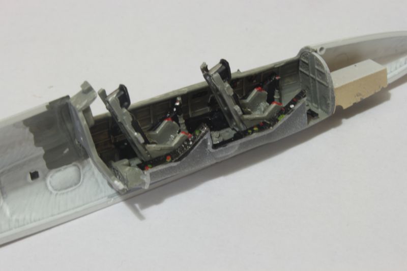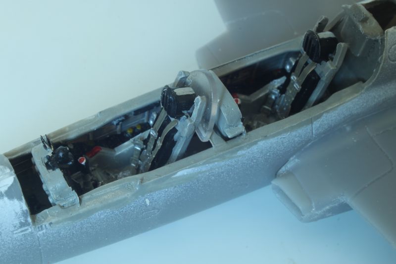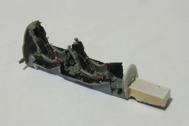 Zanim przystąpiłem do malowania modelu, przygotowałem sobie wszystkie drobiazgi takie jak podwozie, podwieszenia (bardzo fajny patent z zamkami pod pylony wykonane z fototrawionej blaszki) czy pokrywy. Ponadto Koledzy oblatani w „rurkach” wytknęli mi moje „genialne” wklejenie tylnej wręgi w kokpicie. Co było robić? Przecież tak tego nie zostawię. Postanowiłem wymontować tylny fotel, a następnie piłką żyletką i precyzyjnym nożykiem wyciąłem źle wklejony fragment i zamontowałem w sposób prawidłowy.