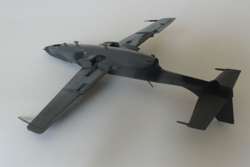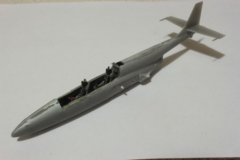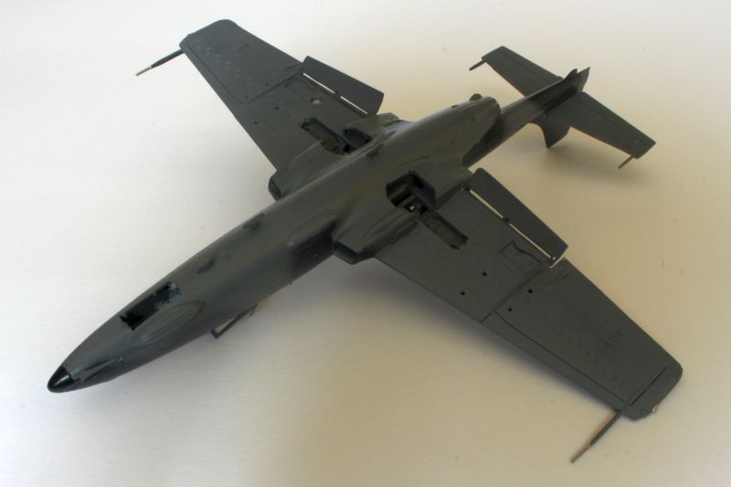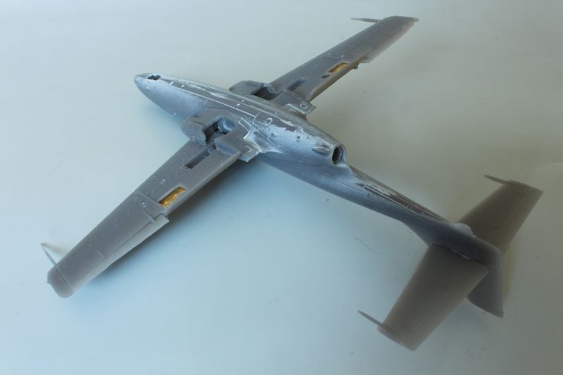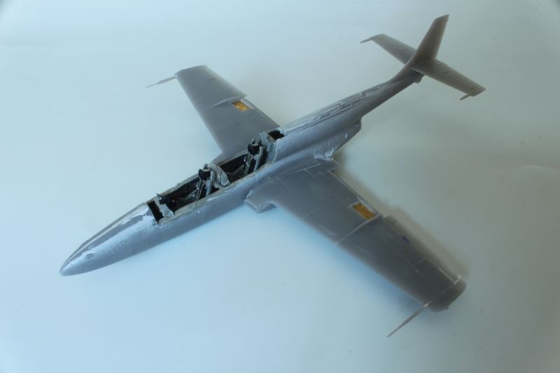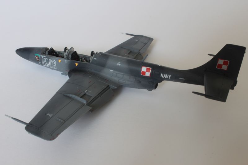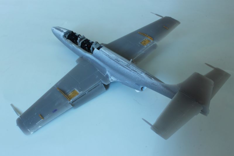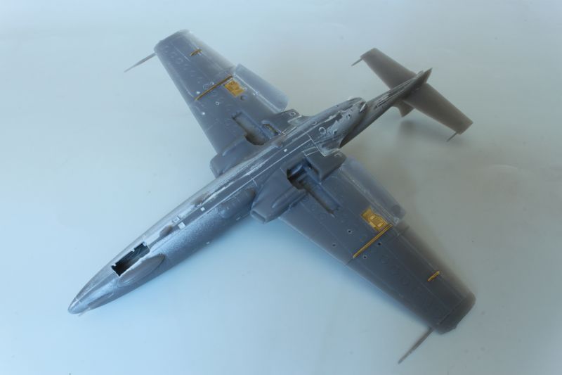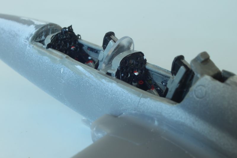 Po zmontowaniu płatów w całość mogłem zabrać się za kokpit. Tu również nie napotkałem na jakieś przeszkody nie do przejścia, to co wzbudziło moje podejrzenia, niezwłocznie przekazałem producentowi. Wylazł natomiast mój brak znajomości w konstrukcji płatowca oraz to, że model budowałem na wyczucie bo bez instrukcji. Efekt – tylną wręgę kokpitu wkleiłem tyłem do przodu, przez co uzyskałem jakiś dziwny twór wystający z kadłuba, mogący od biedy robić za element zawiasu osłony. Nie będąc świadomy własnej ignorancji skleiłem kadłub, dokleiłem płaty i usterzenie, zachwycając się doskonałym spasowaniem poszczególnych segmentów płatowca. Model jest spasowany doskonale, szpachlówka praktycznie nie jest potrzebna, no może do wypełnienia jakiś ubytków powstałych podczas montażu, jak to było w moim przypadku. Potem wystarczyło dokleić większość drobiazgów typu anteny, wyrzutnik łusek. Na tym etapie wkleiłem również fototrawione grzebienie aerodynamiczne. Tutaj wybór należy do modelarza zarówno te z tworzywa jak i z blaszki bardzo wiernie oddają oryginał.