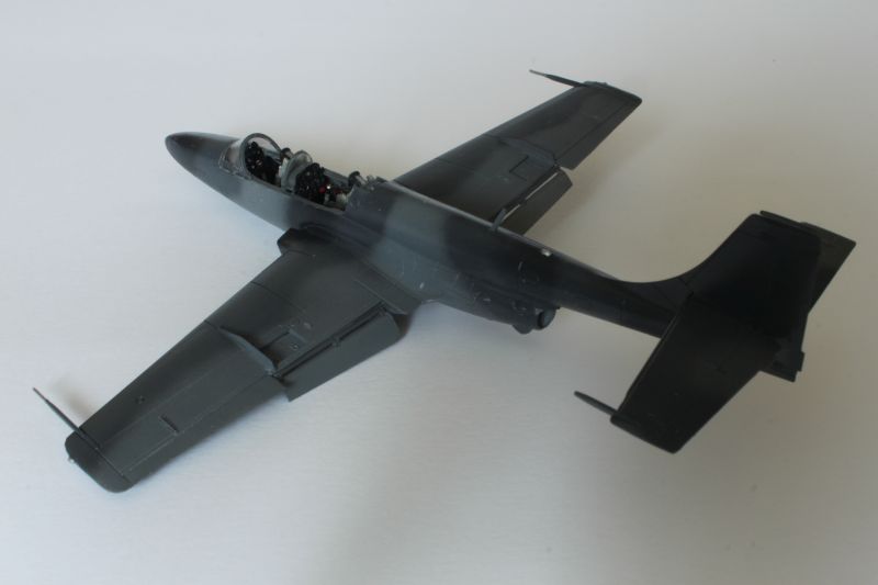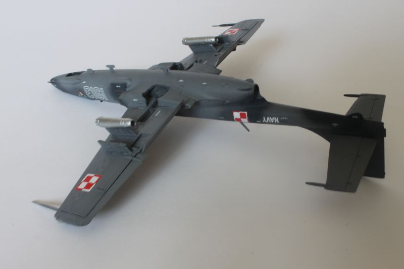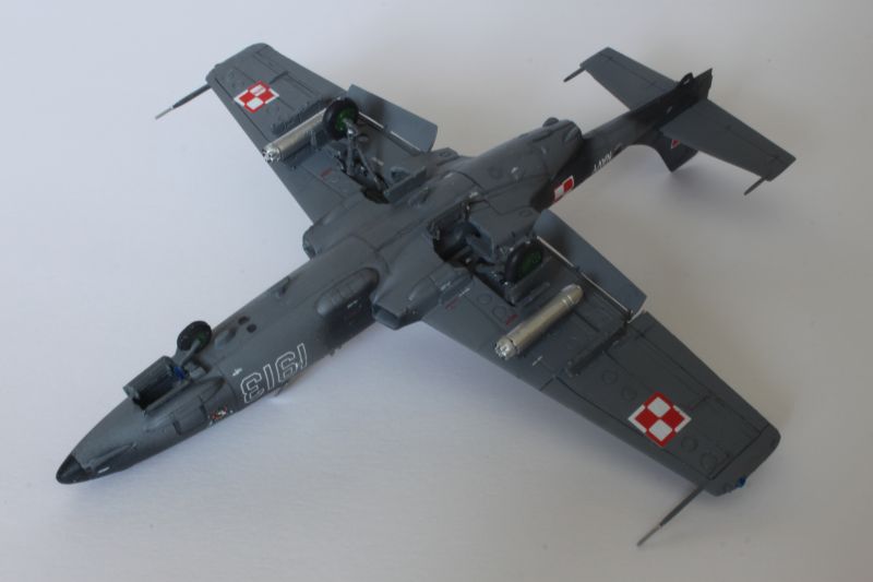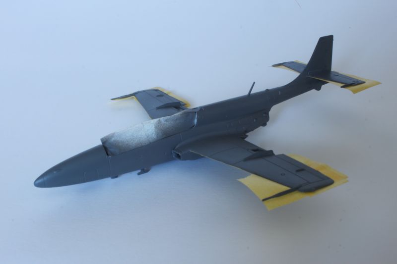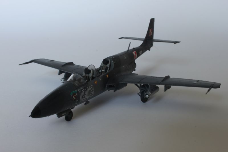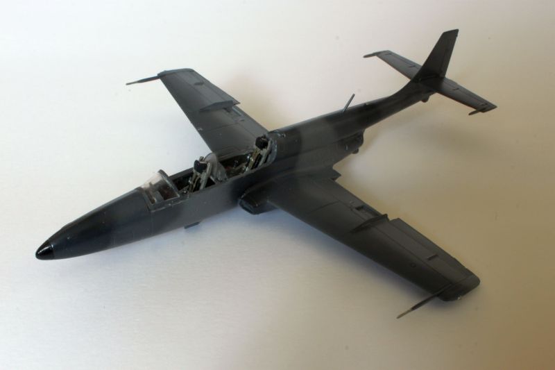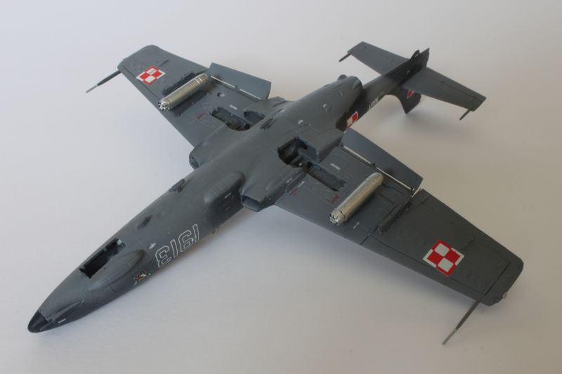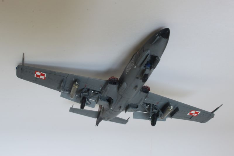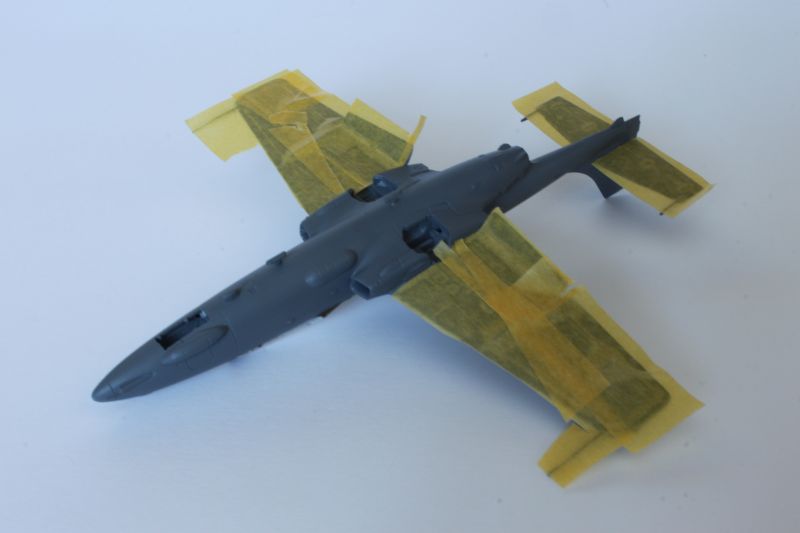 Teraz już mogłem bez przeszkód malować. Tradycyjnie zacząłem od pokrycia modelu podkładem w sprayu. Dla mojej Iskry wybrałem kamuflażowe malowanie z 3 Dywizjonu Lotniczego MW z Siemierowic. Przyznaję się bez bicia, że potraktowałem je nieco dowolnie w stosunku do dokumentacji i doboru wyposażenia, ale moją intencją nie było wykonywanie wiernej repliki (na to przyjdzie jeszcze czas) ale swoisty crach test czegoś co dopiero powstaje, jest dopiero punktem wyjścia na drodze do gotowego produktu. Po wyschnięciu podkładu cały model potraktowałem kolorem jasnoszarym z palety Valleho i po jedgo wyschnięciu zabezpieczyłem taśmą dolne powierzchnie skrzydeł. Następnie z wolnej ręki naniosłem dwa kolejne kolory kamuflażu – średnioszary i czarnoszary, również z palety Vallejo.